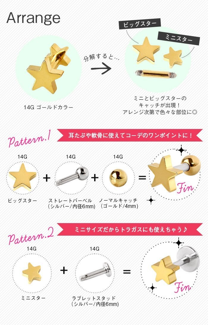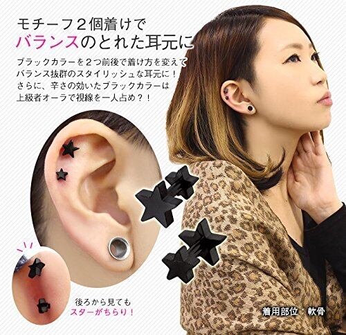 前後どちらから見てもダブルスター!ダブルフェイスデザイン!自分の好きな向きで着けられて、さらにフラットタイプだから耳たぶはもちろん軟骨、トラガスなどどこに着けても◎