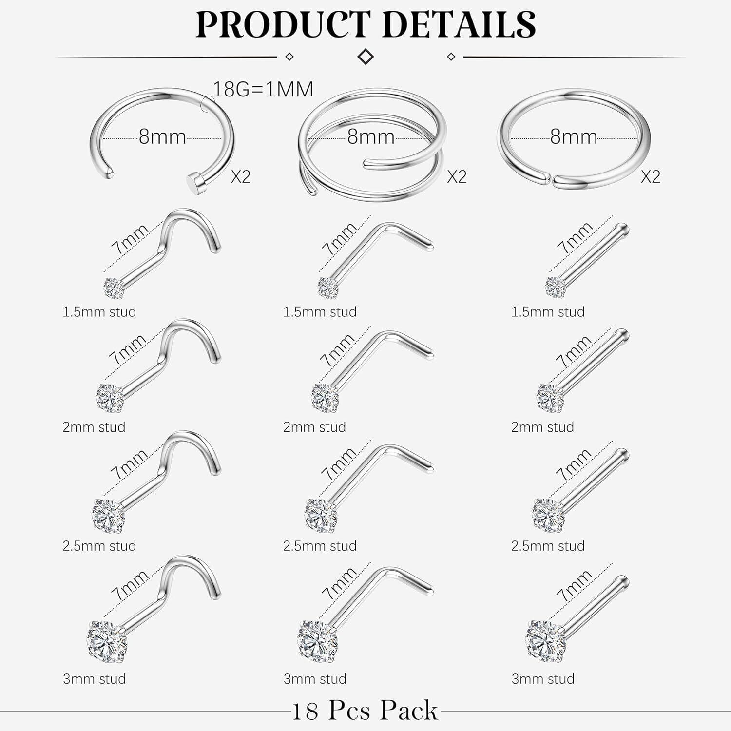 【18点ボディピアスセット】総計18点で、重ね着けでもオシャレです。鼻・軟骨・耳たぶなど様々な部位で活躍してくれるアイテムです。太さのサイズは一般的な鼻ピアスによく使われている18g/20gとなっております。ニーズに合わせてサイズを選ぶことができます。横顔を華やかに、上品に見せてくれ、女性にふさわしいアクセサリーです。