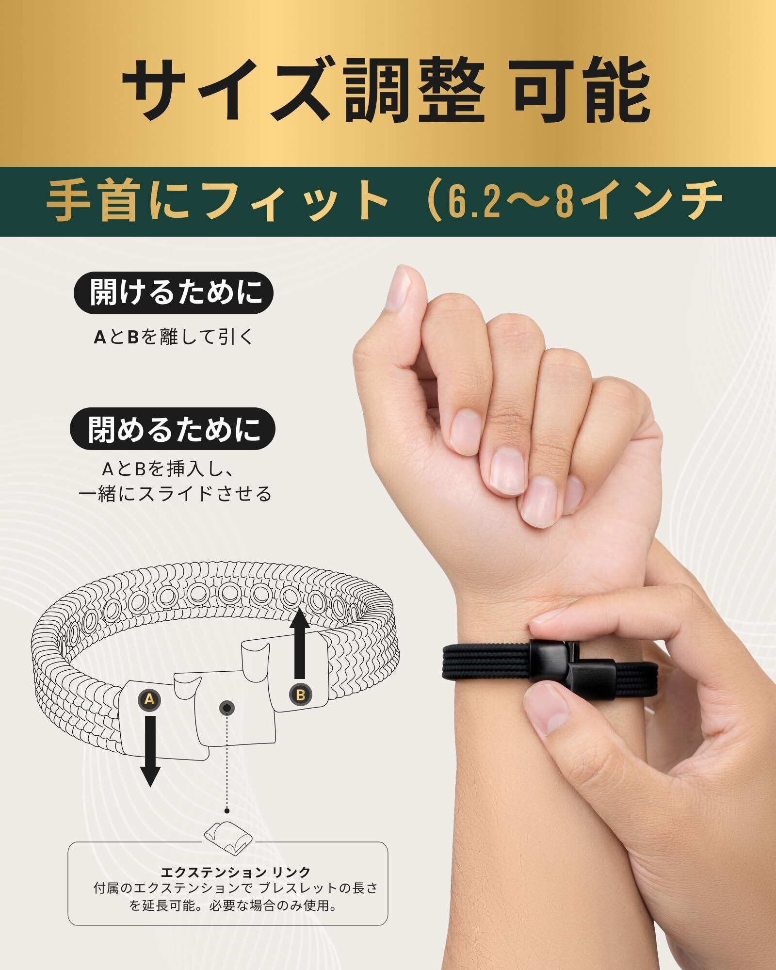 調節可能で男女兼用の磁気ブレスレット: プルオン式クラスプで簡単にサイズ調整が可能。手首周り約14.6cm~20.3cmに対応し、男性にも女性にも快適にフィット。スポーツ時はもちろん、カジュアルなアクセサリーとしても使えるデザインです