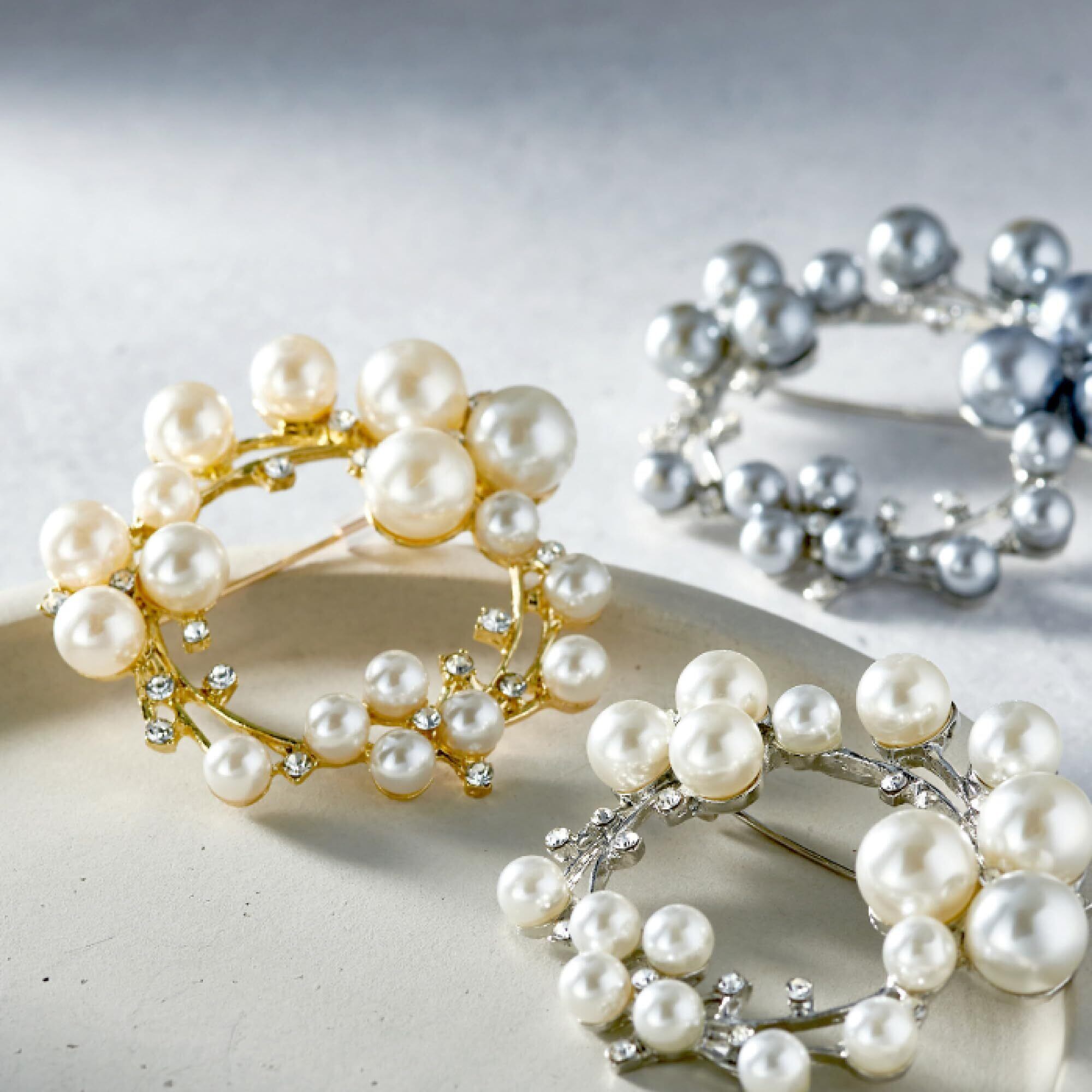 【ランダムサークルパールブローチ】 パールをぜいたくに使用したサークル型ブローチは控えめなストーンのきらめきと パールの艶が落ち着いた上品さとエレガントな華やかさを演出します。 卒業式や入学式などのフォーマルはもちろんいつものワードローブにプラスするだけで ワンランク上の装いを演出できます。
