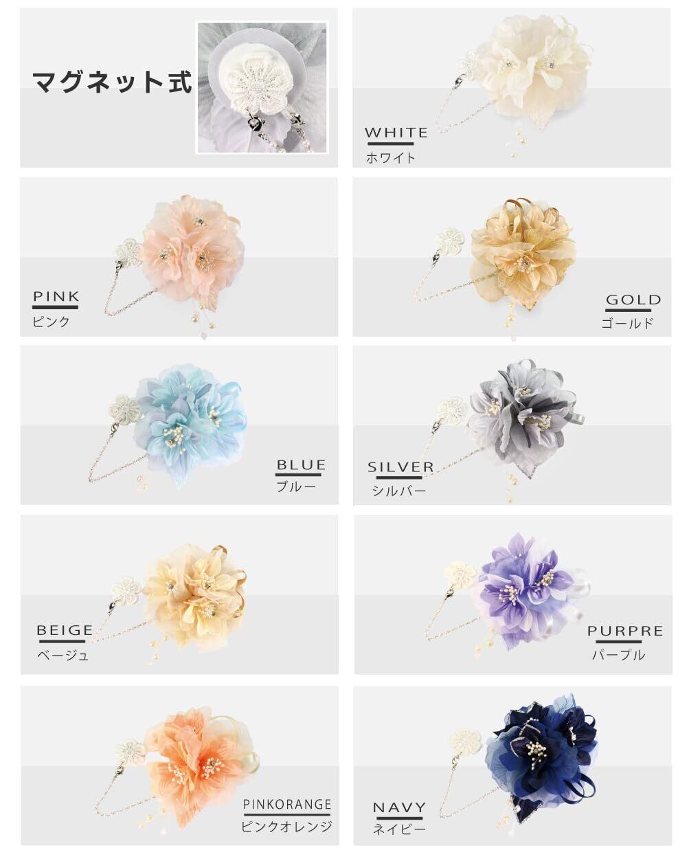 ■簡単装着マグネット仕様:従来のピン&クリップ式のコサージュとは異なりマグネット式のコサージュです。フェルトに包まれた強力なマグネットはどんな厚手のお洋服にもしっかり装着そっと挟むだけだから、お洋服を傷めることなく胸元を帽子やバッグなどに飾りとしてアクセントにすることも可能です