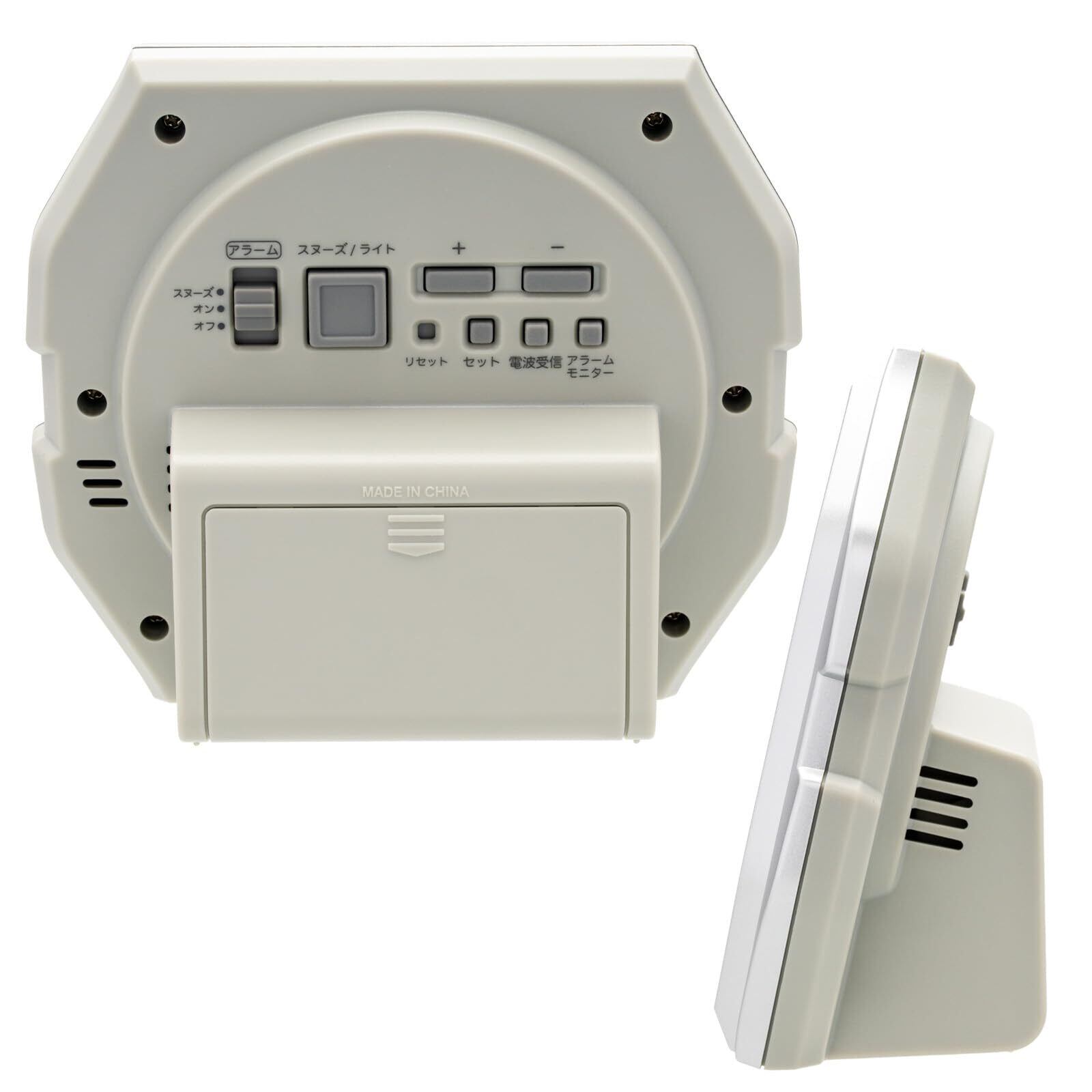 【電波置き時計の機能】電波受信機能(オン/オフ切り替え)、電子音アラーム(スヌーズつき)、LEDライト、温度/湿度表示、カレンダー表示