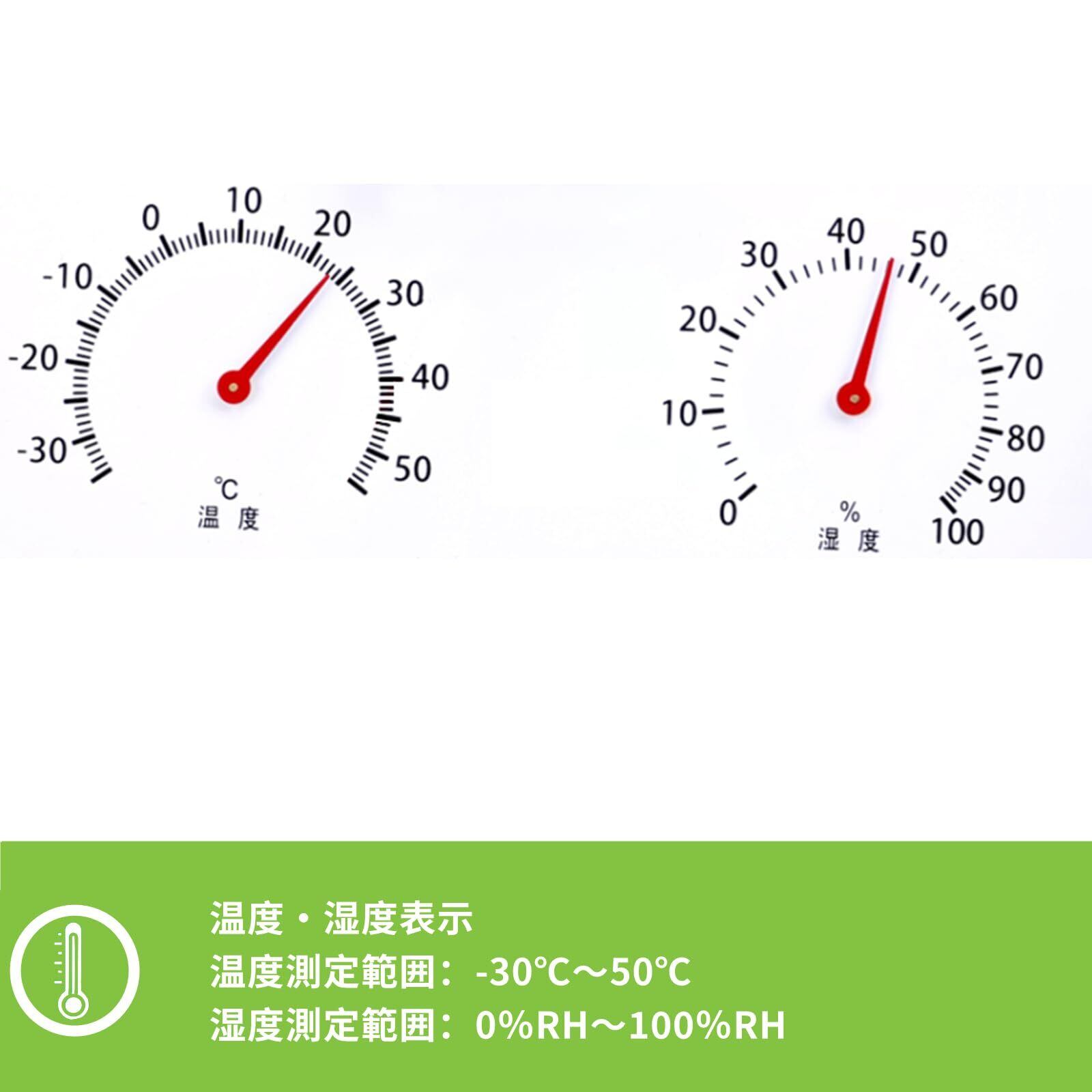機能:電波自動受信で正確な時間を常に提供します。文字盤左右には温度計と湿度計が配置され、連続秒針は滑らかに動いて静かな動作を実現。