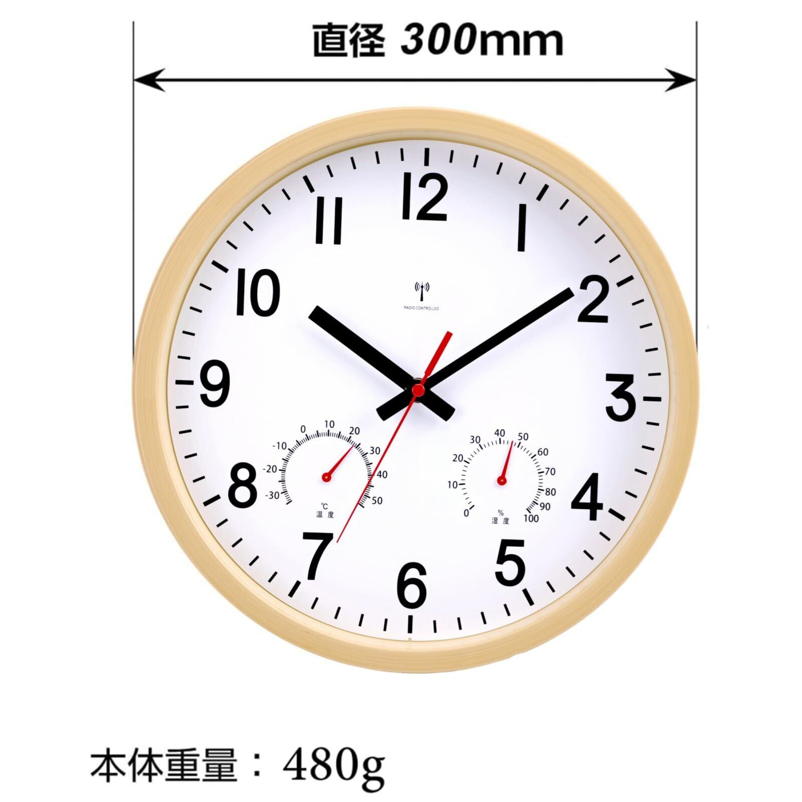 掛け時計 電波時計 温度 湿度 連続秒針 静か アナログ 直径30cm (ホワイト)B-8794
