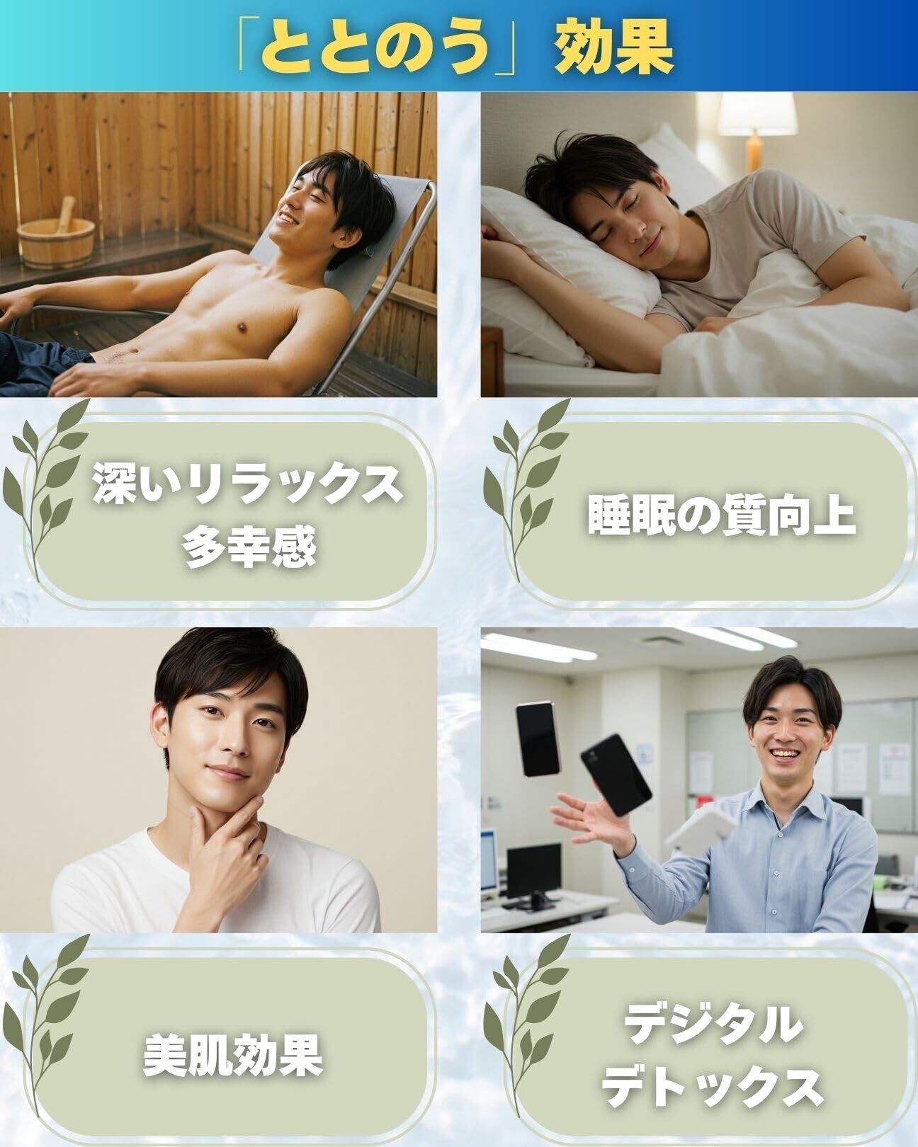 ️【「ととのう」の効果】深いリラックスや多幸感、睡眠の質向上、美肌効果、デジタルデトックスなどサウナでととのう事によって心身ともに様々な効果を得ることができます。