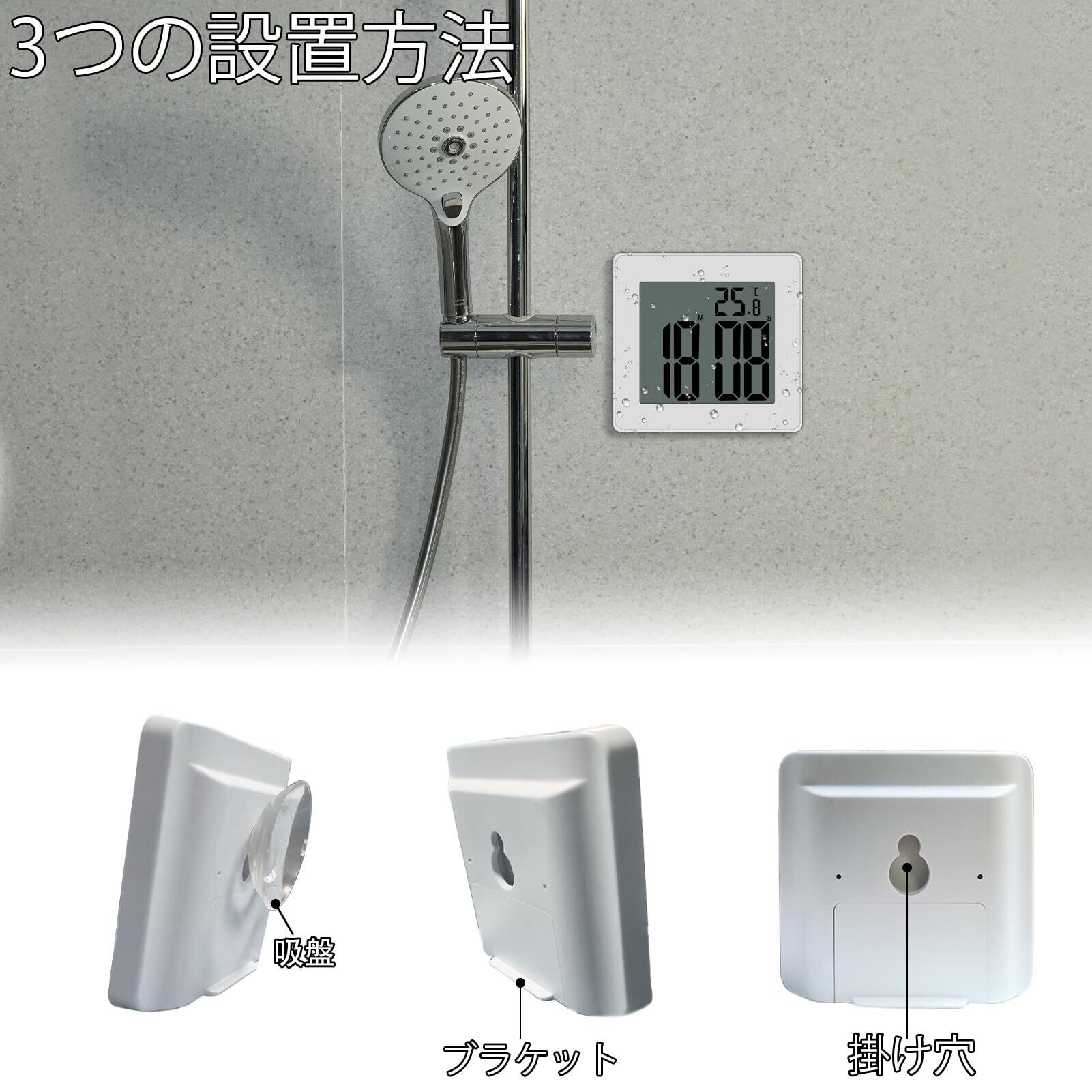 防水時計 LCD大画面 24H時間 温度表示 防水時計 お風呂用 吸盤付き (白)