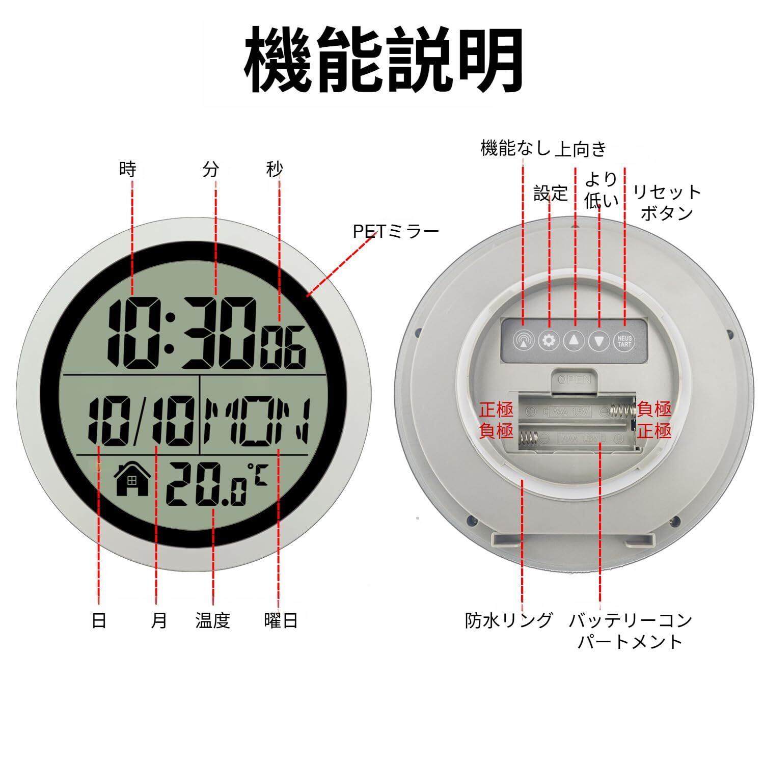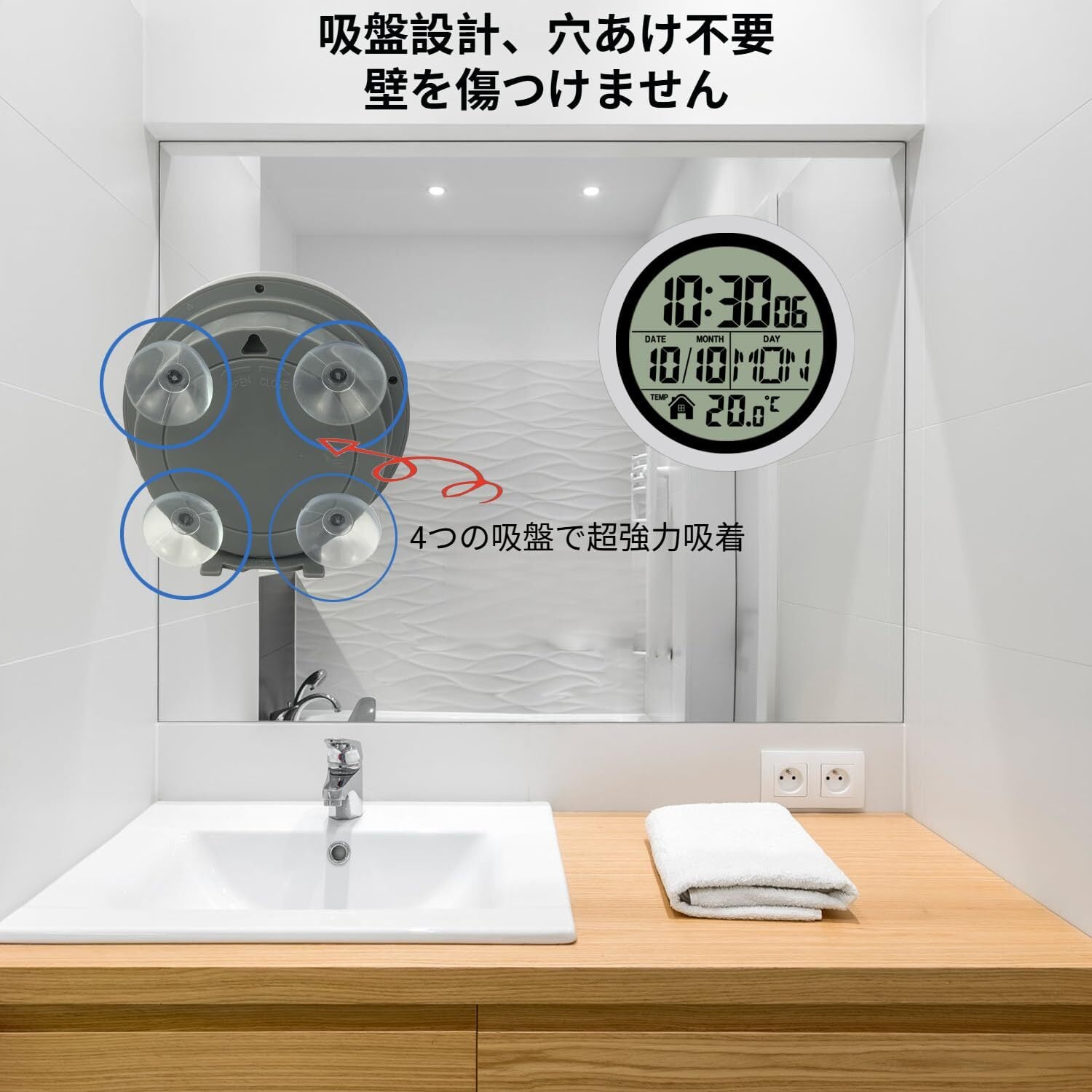 1. [防水性能と設置方法] IPX4防滴仕様のお風呂時計は、水しぶきにも強く、安心してバスルームで使用できます。吸盤とマグネットの2種類の設置方法を採用しており、強力な吸盤で簡単に壁に取り付けられます。また、軽量設計のため、移動も自由自在で、必要な場所にすぐに設置可能です。