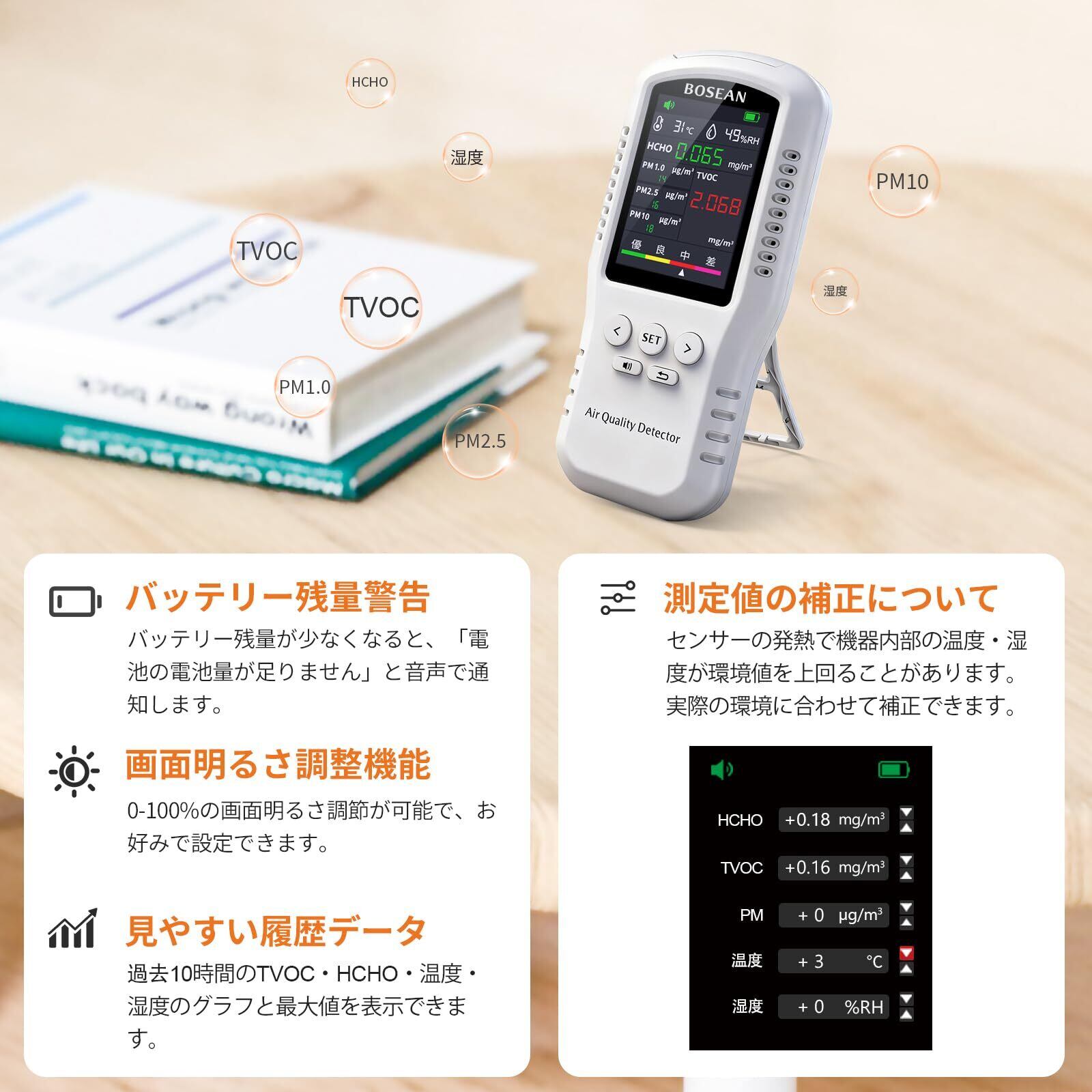 【在庫処分】BOSEAN 臭気測定器 空気測定器 測定器 pm2.5 TVOC HCHO 温度 湿度 臭気計測器 データで視覚化 ホルムアルデヒド ブレスチェッカー 匂いチェッカー 臭いセンサー 匂いセンサー 測定 ニオイチェッカー 匂い測定器 LCD大画面ディスプレイ 多機能 室内空気質モニター 空気質検査器 家庭 オフィス 倉庫 台所 車 日本語と英語 切り替え可能 USB充電