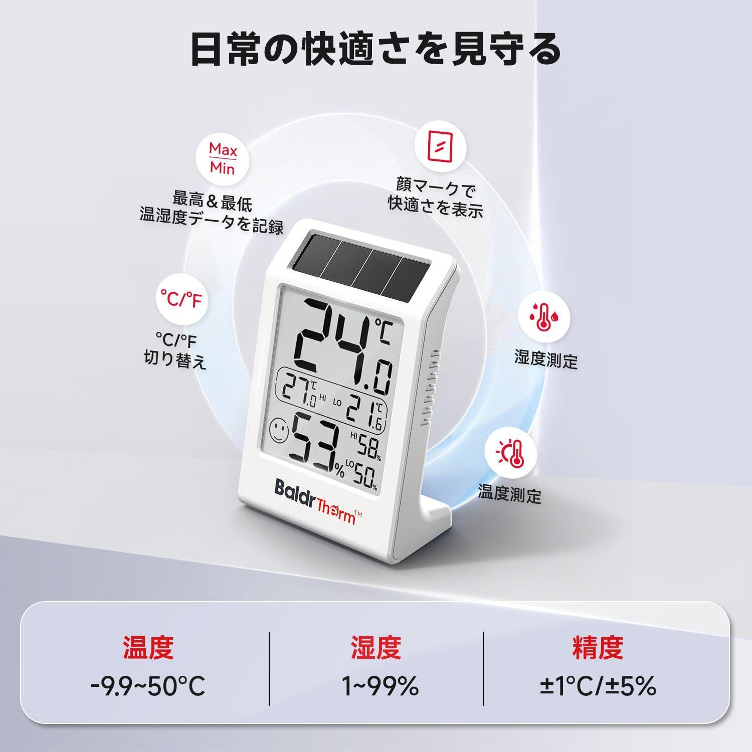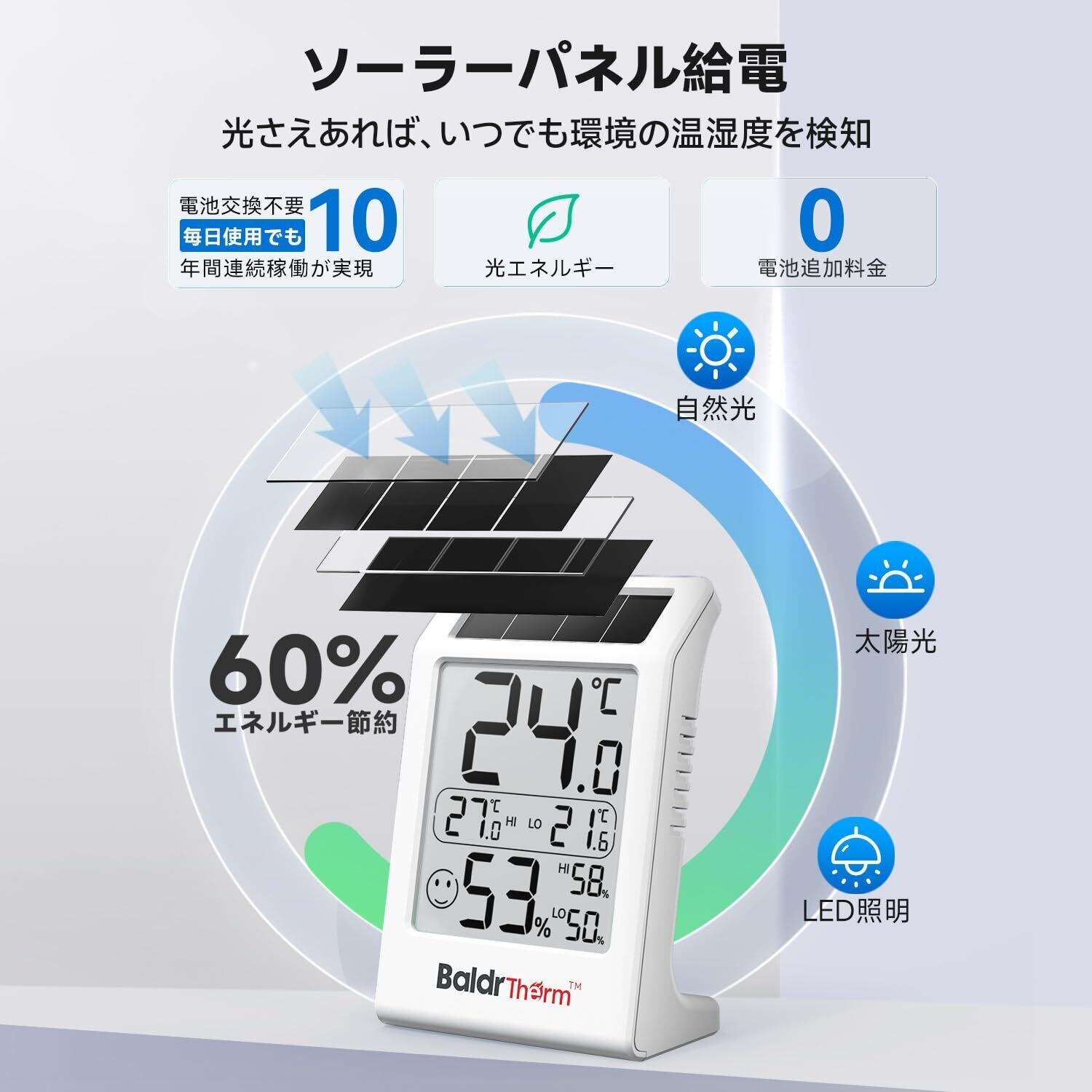 【在庫セール】BaldrTherm 温湿度計 デジタル 屋内 屋外兼用 大画面 大文字 見やすい ソーラー太陽光パネル・電池の二重電源 最高最低メモリー 高精度 省エネ 快適度顔表示 スタンド 壁掛け コンパクト インフルエンザ 熱中症 ハムスター ホワイト B0590TH