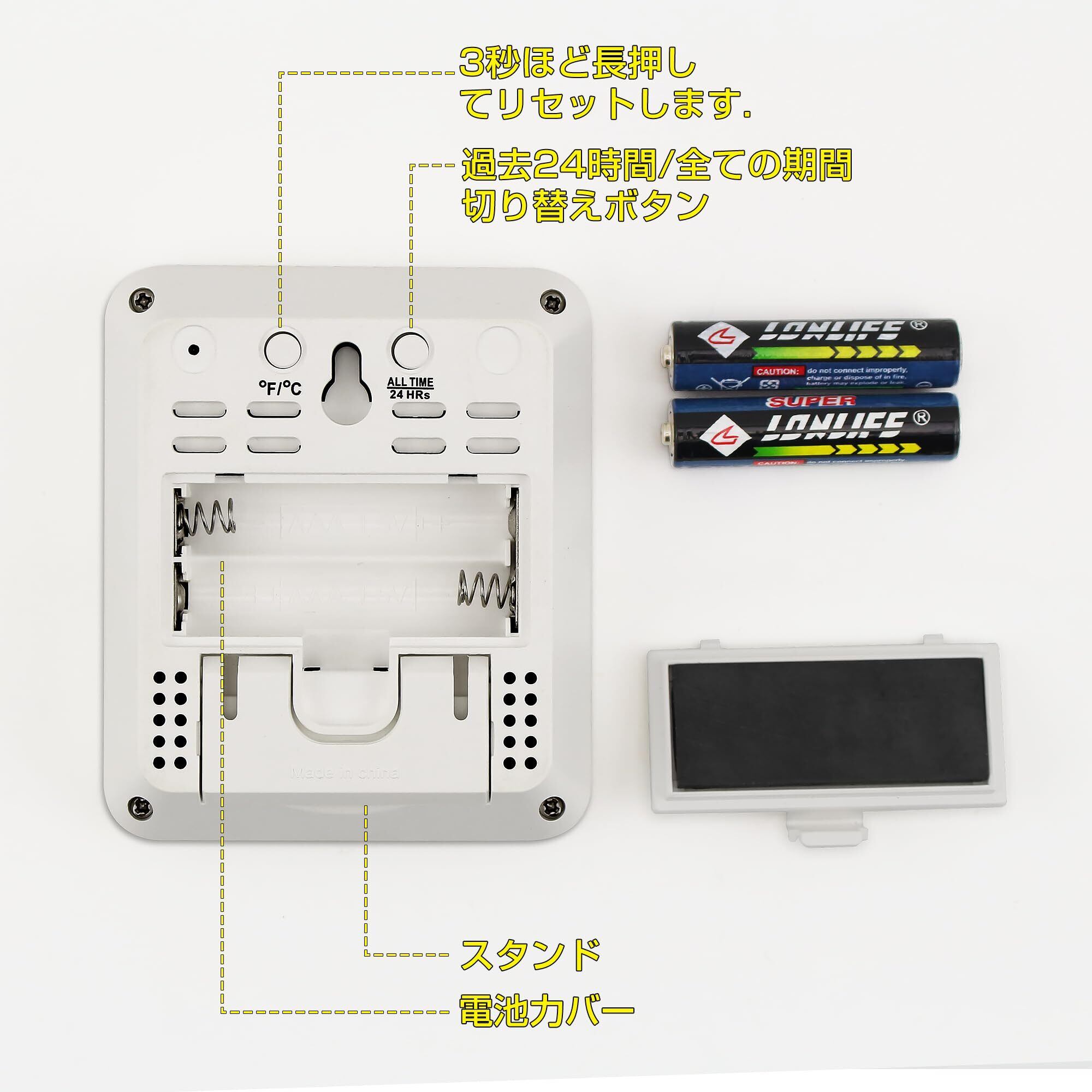 【最高・最低温湿度値の表示】過去のサイクルの最高・最低の温度また湿度を記録することができ、過去時間の温湿度の変化を簡単に把握できます。裏側面のALL TIME/24HRsボタンを一度押すなら、記録サイクルが24時間/全期間を切り替えます。CLEARボタンを3秒で押すなら、リセットできます。
