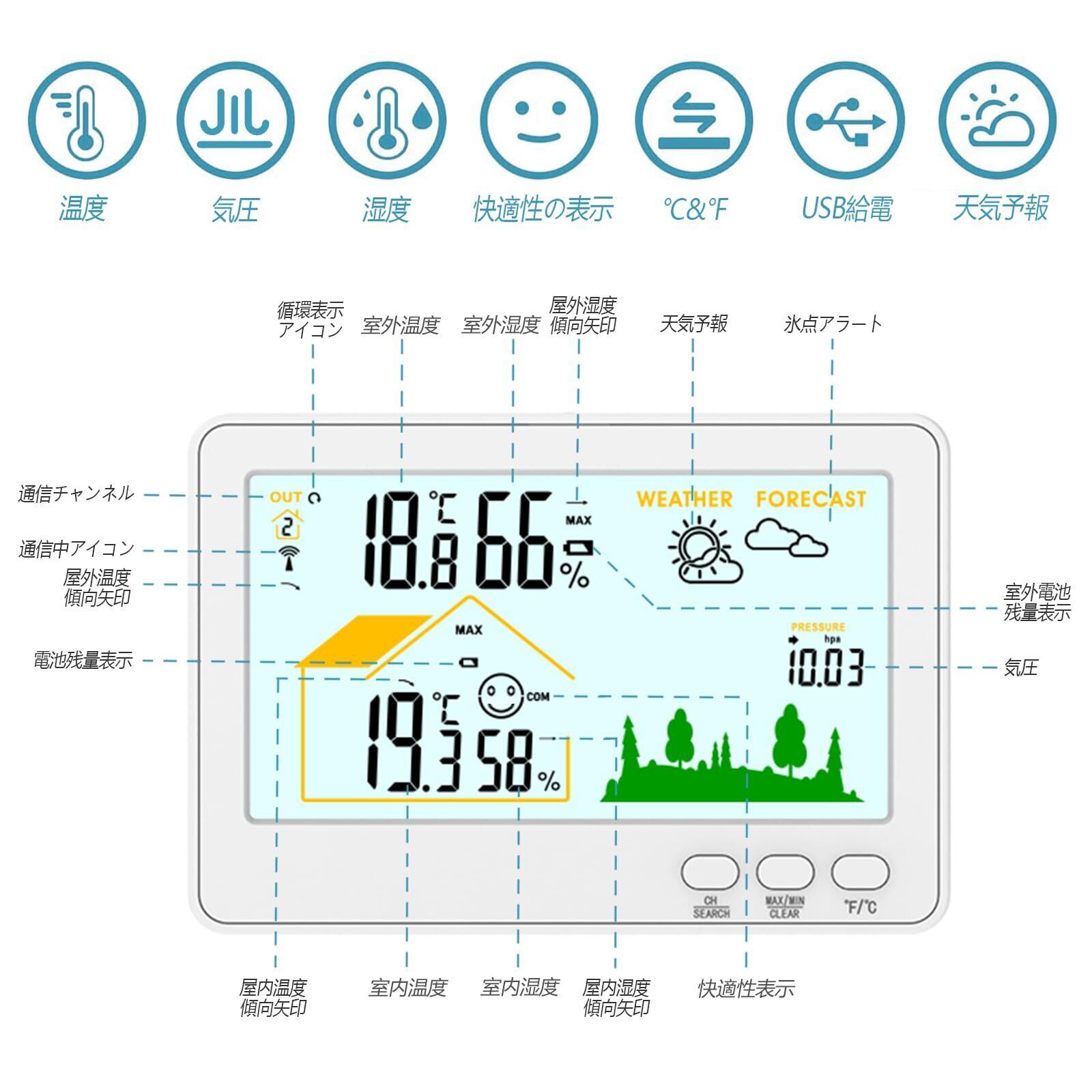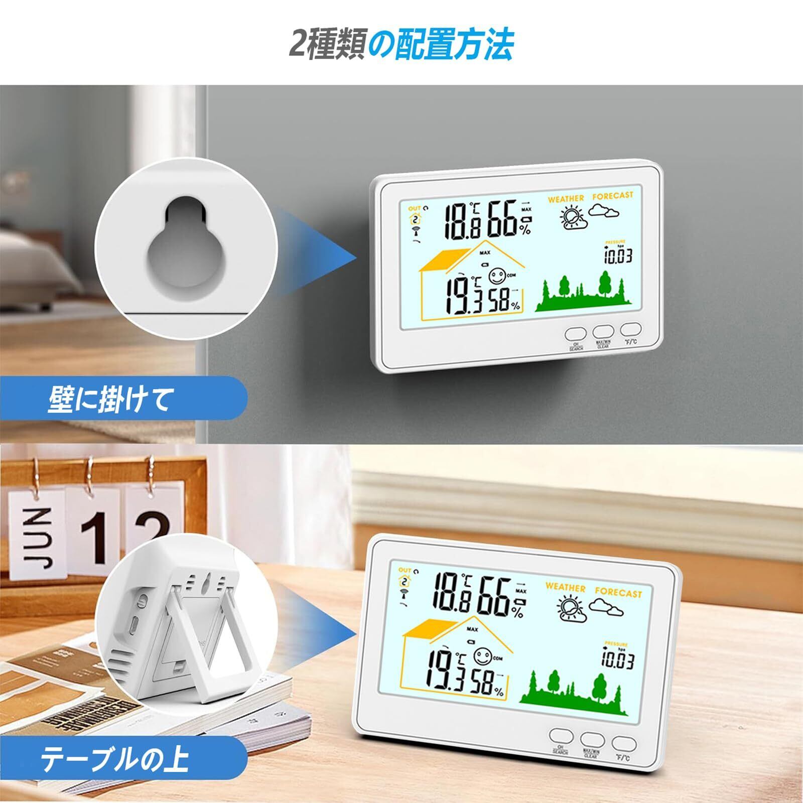 デジタル温度湿度計 室内/室外 ワイヤレス温湿度計 外気温湿度 天気予報/気圧表示/LCD大画面/バックライト/最高最低温湿度/快適レベル/温度と湿度傾向図表示/置き掛け両用 ホームオフィス温室倉庫使用 健康管理 温度管理 日本語取扱説明書 ホワイト