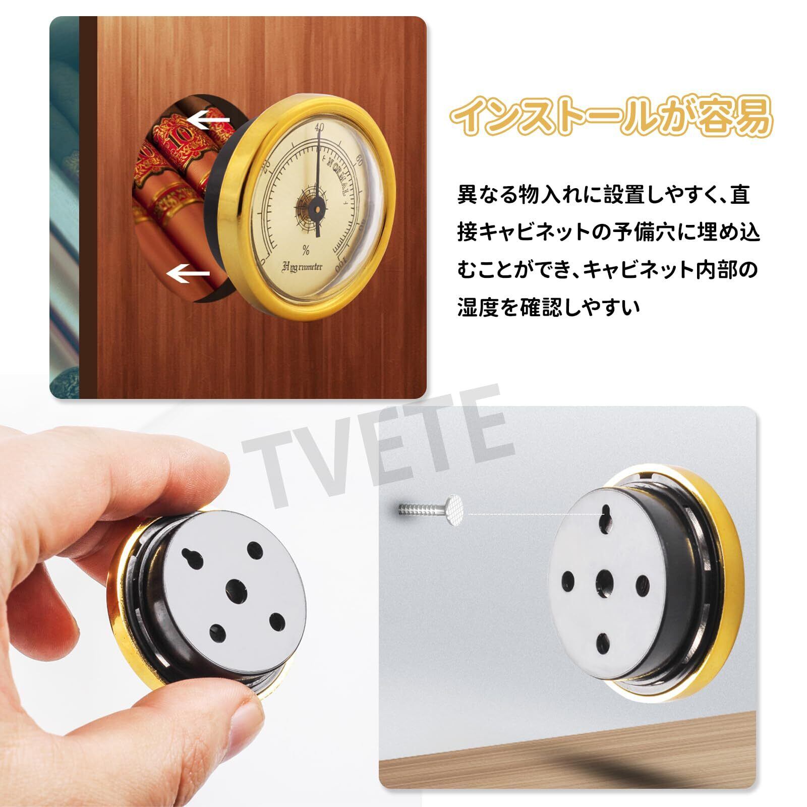 【材質】:機械式湿度計の材質は合金とアクリルで、丈夫で耐久性があります。測定湿度範囲は約0%〜100%です。直径約3.6cmの穴に埋め込むことができ、背面に小さな穴があっても直接掛けることができます。ボックスに直接入れることもできるので、とても便利です。