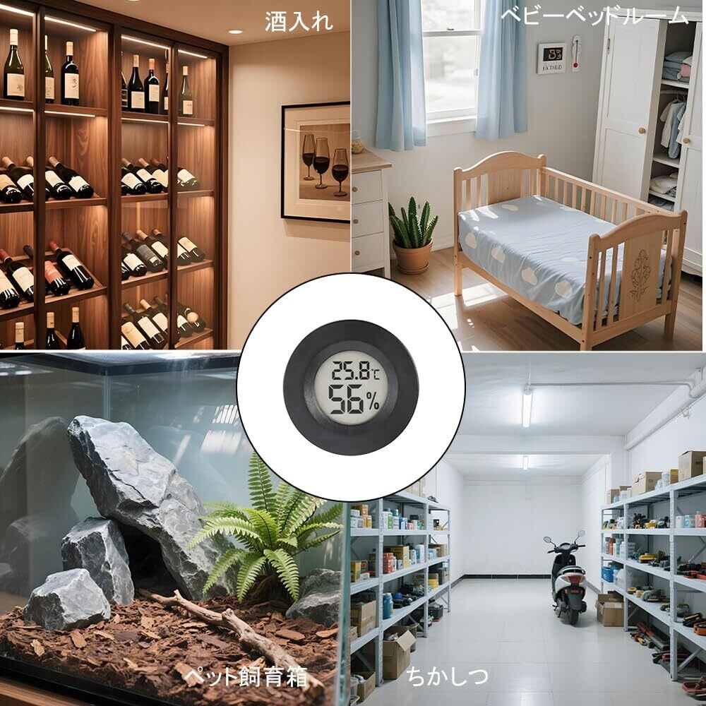 【幅広い用途に対応】:家庭、オフィス、車内、学校、ホテル、研究室、幼稚園、水産養殖、工場、図書館、温室、爬虫類の飼育ケース、空調設備のある場所など、さまざまな場所で使用できる小型デジタル温湿度計です。