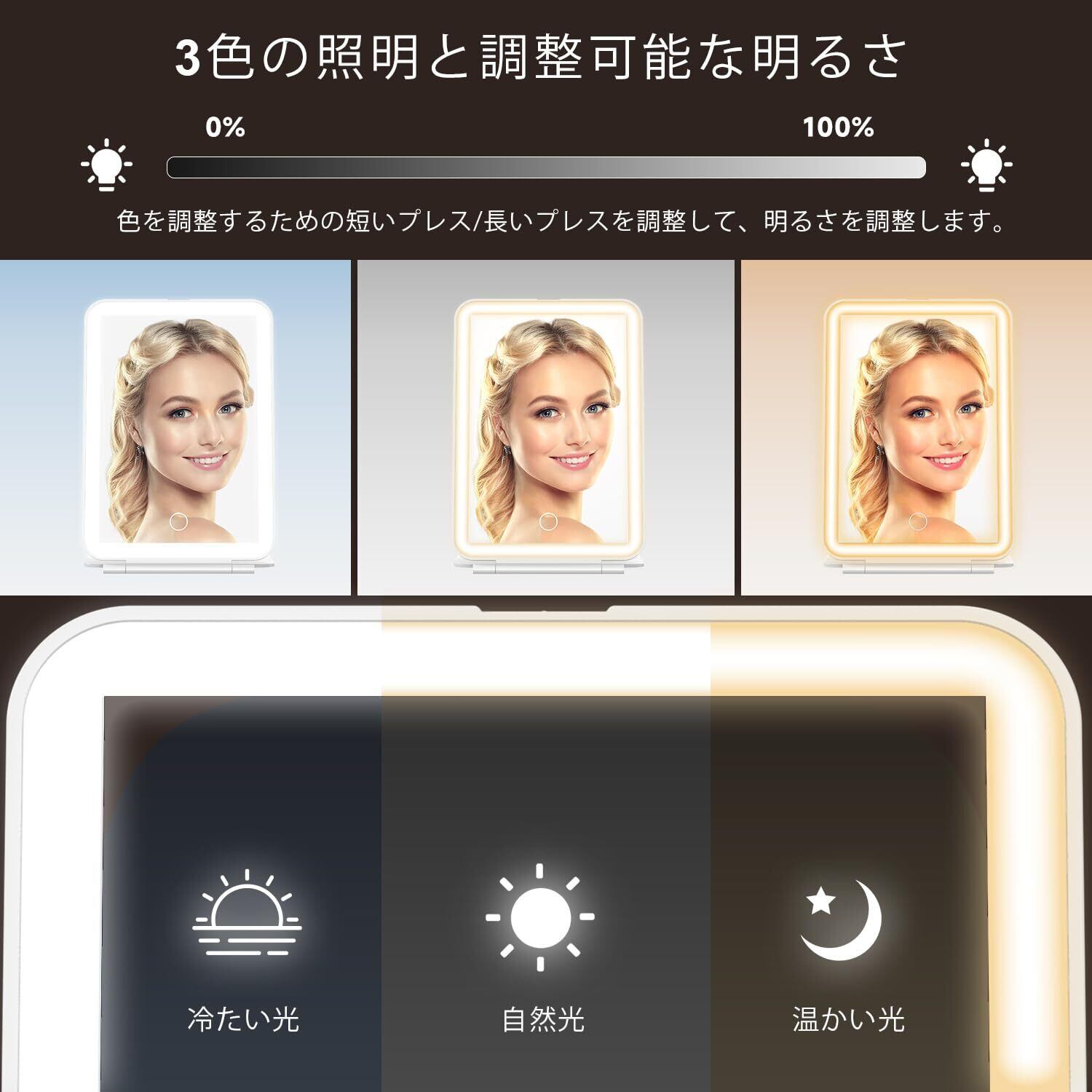 【3色ライト・色収差に別れを告げる】女優ミラーのスイッチをワンタッチでライトをオンオフし、インタラクティブボタンをクリックして暖色光、自然光、冷白色光モードを自由に切り替えます。長押しすると無段階に調光でき、明るさを自由にコントロールできます。毎日の通勤メイクでも、絶妙な夜のメイクでも、適切な光を見つけることができ、メイクは快適で自然になります。※製品到着時はバッテリー残量が少なく、光が弱く感じられる場合がございます。初めて使用するときは、付属のUSBケーブルを使用して完全に充電することを忘れないでください~