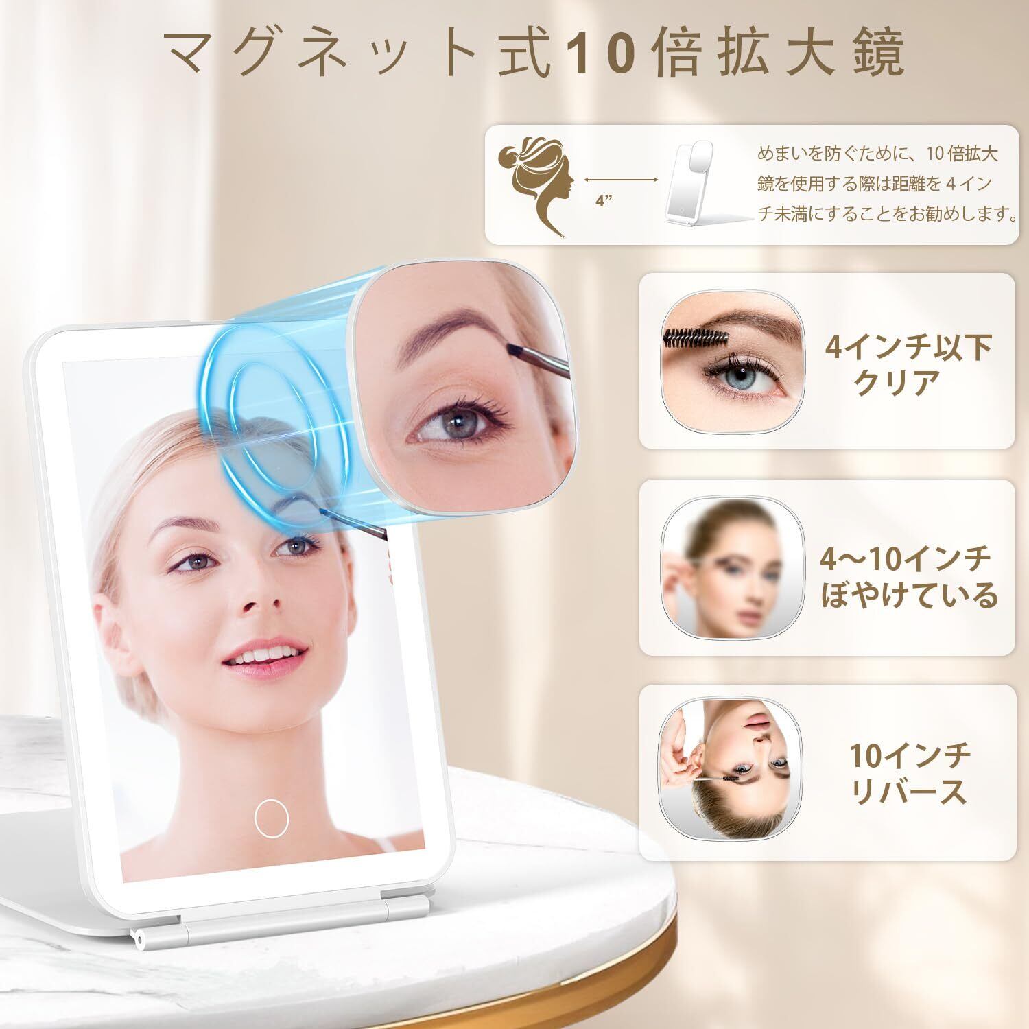 卓上 メイク 鏡 女優ミラー ライト付き - LED折り畳み式 化粧鏡 卓上鏡 3光色のライト付き調整可能 無段階調光、1000mAh大容量バッテリー 10X拡大鏡 メイク鏡 スタンド 卓上ミラー 角度は自由に調整、収納便利 消し忘れ防止機能 持ち運びに便利、13 x 19.3cm(5 x 7インチ)、家庭用 旅行用 - ホワイト