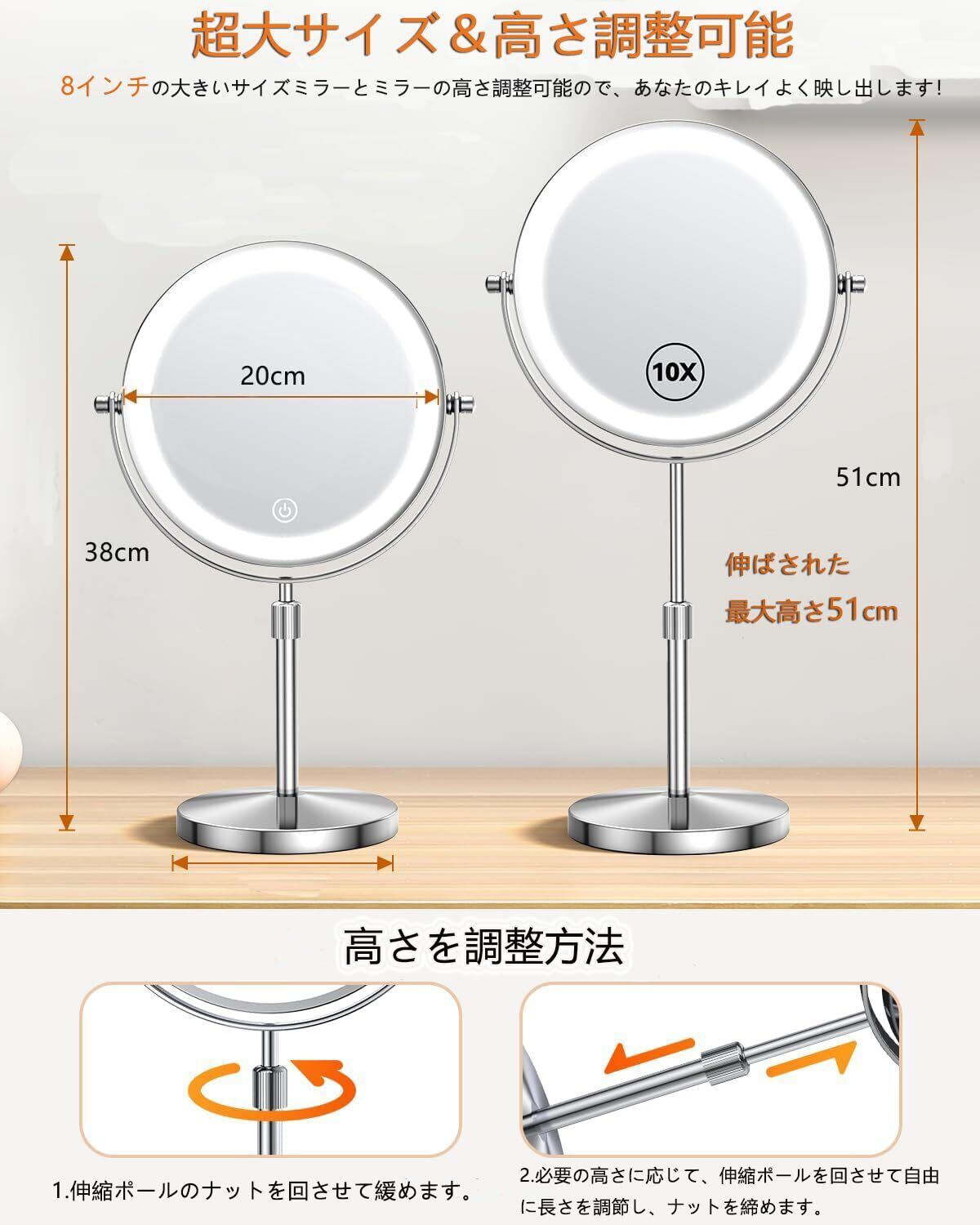 【8インチサイズ&高さ調整】化粧鏡は8インチの大きいサイズ、鏡面の直径は20CMで、あなたのキレイよく映し出します。高級感ある鉄・スチールと華やかな存在感の光学ガラスを作って、透明度、反射性と解像度が高いです。さらに、最新版女優ミラーがスタンドの調節高さデザインあり、最低38cmから最大48cmの位置に固定することができます。ミラーの高さが男性も女性も子供も、背筋を伸ばしても、視線に合わせてミラーの高さを調節できます!メイク時、ちょうど顔の前にミラーがくるように調整できるからとても快適です。なお、シンプルで飽きのこない定番デザインのミラーを、表面は高級感な銀色の輝きを放ちつつ、どんな場所に置いても、お部屋を素敵に演出してくれます。ミラー高さを調整方法 1.伸縮ポールのナットを回させて緩めます。 2.必要の高さに応じて、伸縮ポールを回させて自由に長さを調節し、ナットを締めます。 ご注意:しっかりと固定されているか確認して、滑ったら再度お取り付けください。