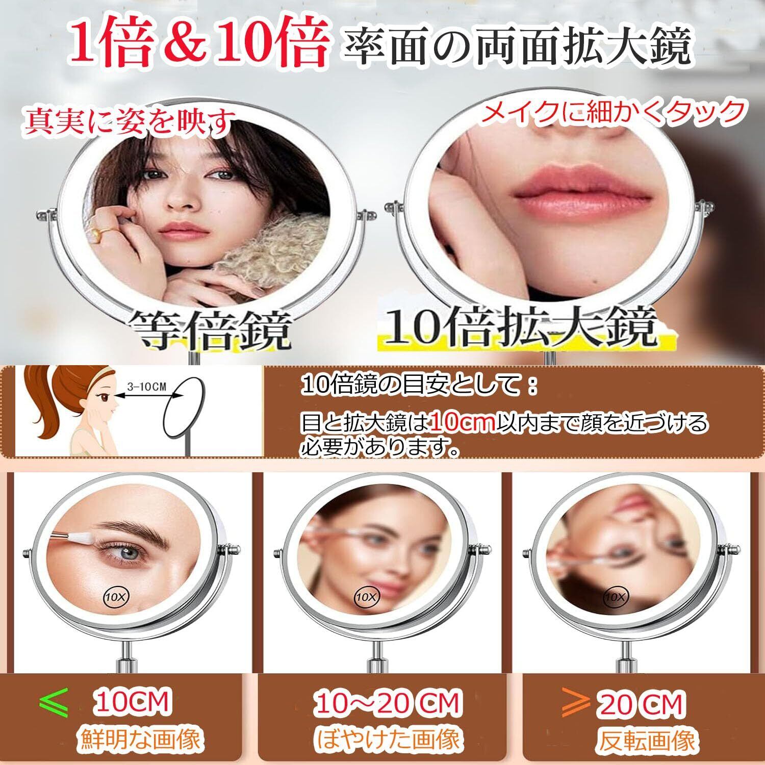 【等倍鏡&10倍拡大鏡の両面鏡】女優ミラー化粧鏡は等倍と10倍の拡大鏡が表と裏についており、必要に応じて回転させることで変えられます。等倍鏡は自然な姿を真実に映って、片面は気になる箇所を手早くチェックできる10倍拡大鏡。10倍拡大鏡はアイラインや毛穴カバーなど、顔の部位をクローズアップして入念にメイクを施すことができるので、プロに近い仕上がりにすることができます。老眼や目が悪い人でも上手にメイクやヘポイントメイクや眉カットをしたいときに重宝します。スキンケア、ニキビを潰すなど細かい作業もしやすい、お肌の細かいところまで隅々チェックできます。さらに、バスルームや洗面所などで使いたい方にもおすすめです。10倍拡大鏡面目安としては:目と拡大鏡は5-10cm以内の距離を持っているのはベストです。