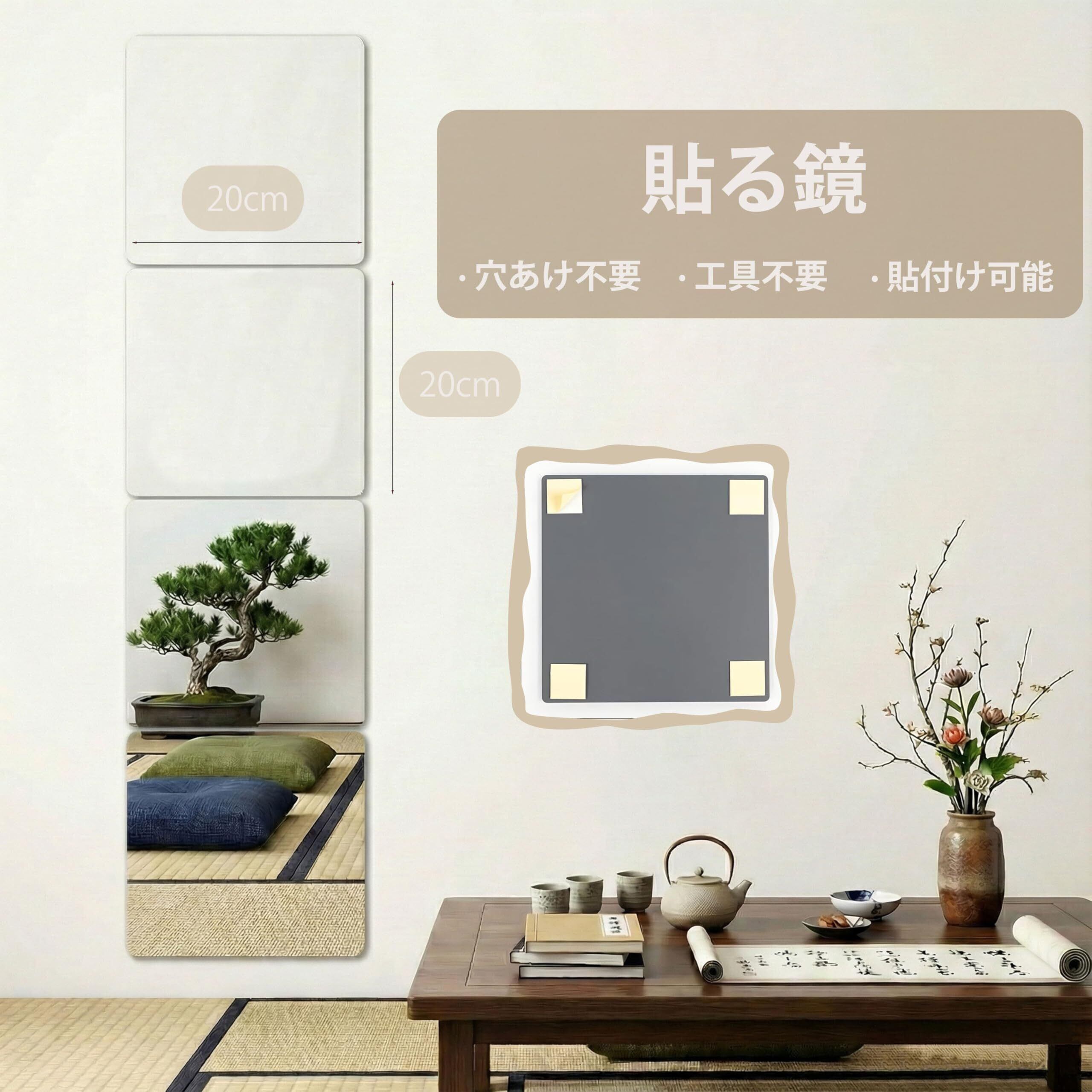 【数量限定】割れない鏡 壁掛け 全身鏡 姿見鏡 貼る鏡 - 浴室 鏡 クローゼット 玄関 ドア ウォールミラー - アクリルミラー 子供部屋 賃貸OK 簡単軽量ミラー - 飛散防止 防災 地震対策 穴あけ不要 工具不要 超軽い 鮮明 - 20x20cm 角丸 4枚セット