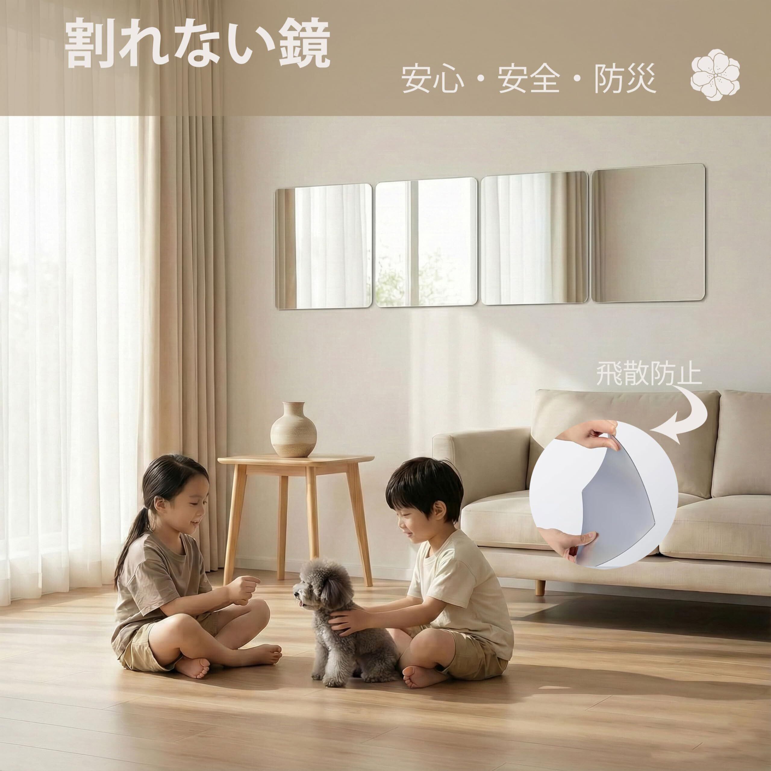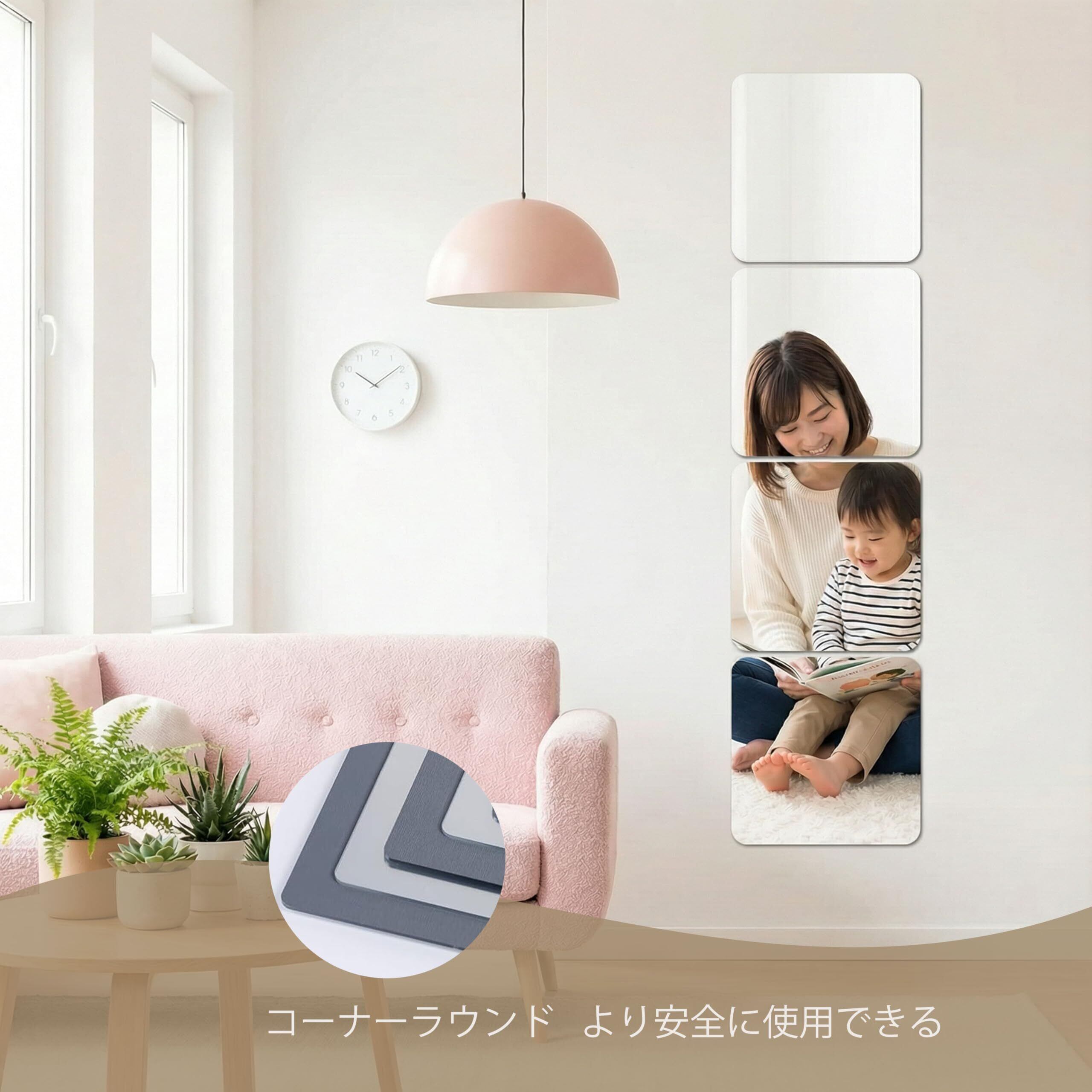 安全設計と高品質素材で、安心してご使用いただけます 【コアスペック】20cm×20cm×2mm、4 枚セット|アクリル製(1 枚あたり 12g)|フレームレスデザイン|専用粘着シール付属【安全設計】角丸加工を施し、飛散防止仕様を採用。落下時の破片飛散リスクを抑えているため、お子様のいる空間やペットのいるご家庭でも安心してお使いいただけます。【品質へのこだわり】歪みを軽減する特殊製法を採用(アクリル素材の特性上、完全な無歪みではございません)。近距離での使用時には、ガラス製ミラーに匹敵するクリアな映りを実現。教育施設やスポーツ施設での導入実績も豊富です。
