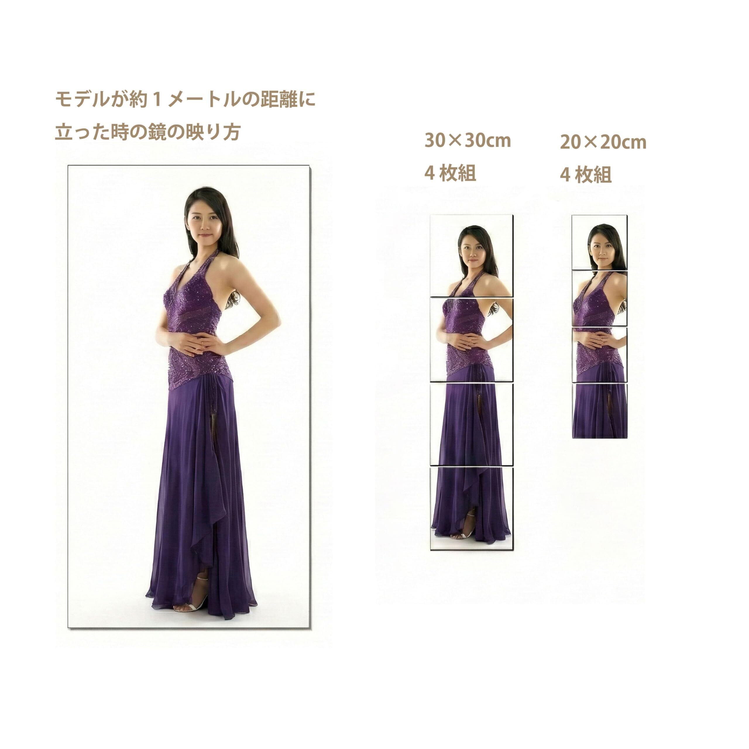 お悩みスッキリ解消!自由に組み合わせ可能・省スペースなシール式貼りミラー 部屋が狭くて全身鏡を置くスペースがない?賃貸物件で壁に穴を開けられない?このシール式貼りミラーで、これらのお悩みを解消できます! 【コア機能】4 枚セットで自由に組み合わせられます。縦に並べれば全身鏡として、ひし形やオリジナルの配置にすればインテリアのアクセントに、1 枚だけで髪型チェックにも活用できます! 【付加価値】専用粘着シール付きで工具は一切不要。1 人でも約 10 分で簡単に設置完了。スペースを取らず、お手入れも簡単なので、日常の身だしなみチェックがスムーズに行えます。