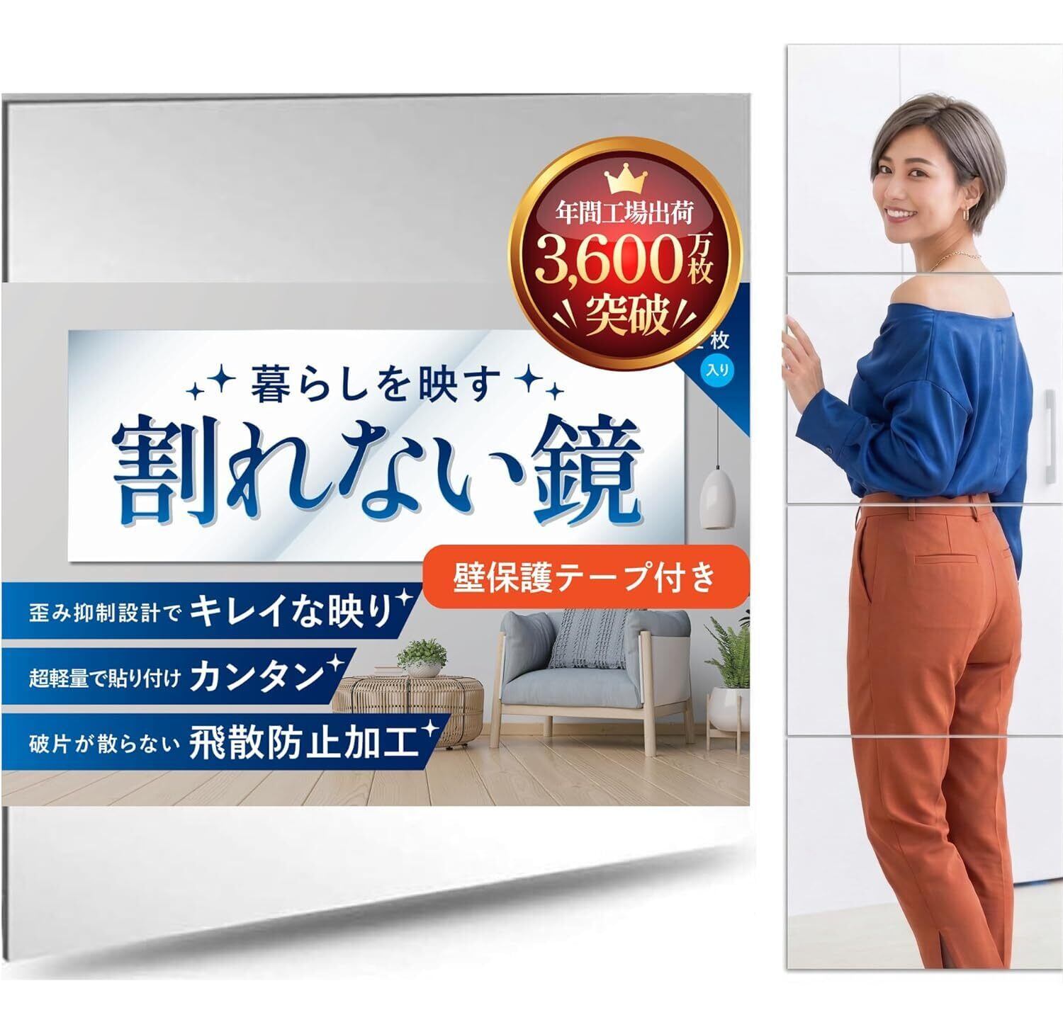 【壁保護テープ付き 安心して貼れる全身鏡】どこでも貼れるアクリル鏡 4枚入り[ガラスのように綺麗な映りでホテルライクな雰囲気を] ウォールミラー