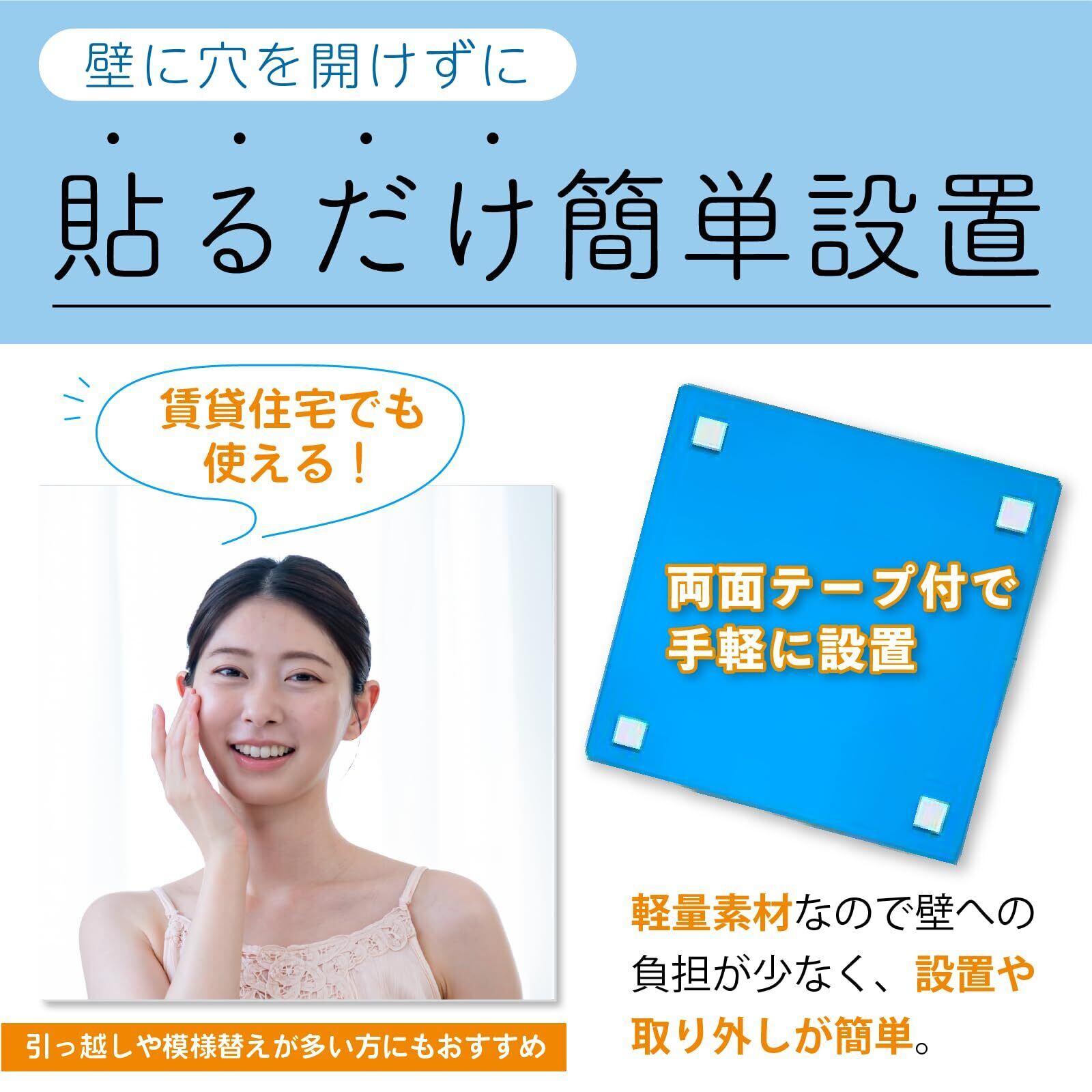 賃貸でも使いやすい貼り付けミラー:壁に穴を開けずに設置できるため、賃貸住宅でも取り入れやすい仕様。軽量素材なので壁への負担が少なく、設置や取り外しも手軽に行えます。引っ越しや模様替えが多い方にもおすすめです。