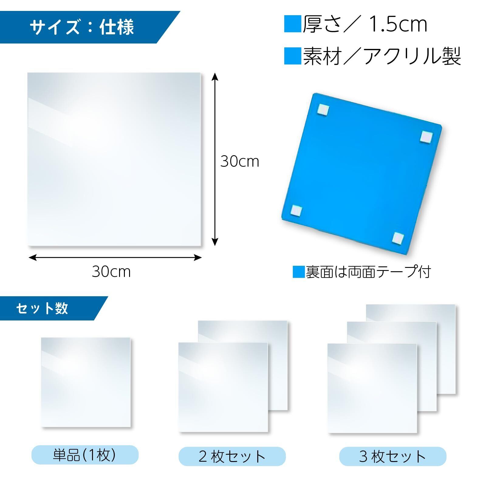 サイズ、仕様:1枚。正方形30×30cm。厚さ1.5cm。割れにくいアクリル製。両面テープで簡単貼り付け。