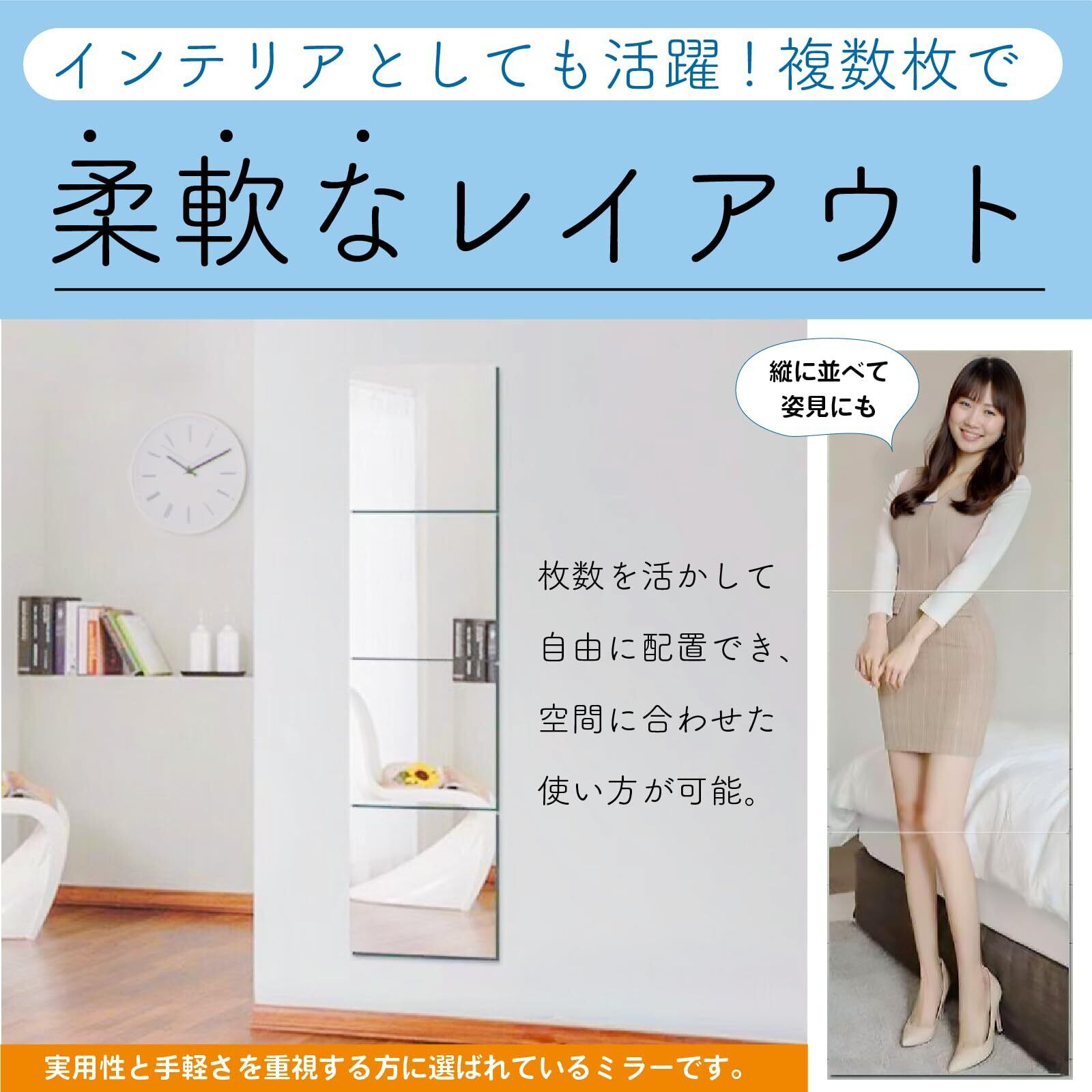 複数枚で柔軟なレイアウト:枚数を活かして自由に配置でき、空間に合わせた使い方が可能。非常時の安全性を意識しつつ、普段はインテリアとしても活躍します。実用性と手軽さを重視する方に選ばれているミラーです。