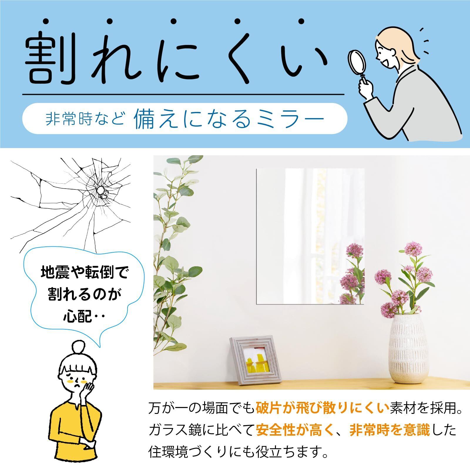 割れにくく備えになるミラー:地震や転倒など万が一の場面でも破片が飛び散りにくい素材を採用。ガラス鏡に比べて安全性が高く、非常時を意識した住環境づくりにも役立ちます。日常使いと防災意識を両立できるミラーです。