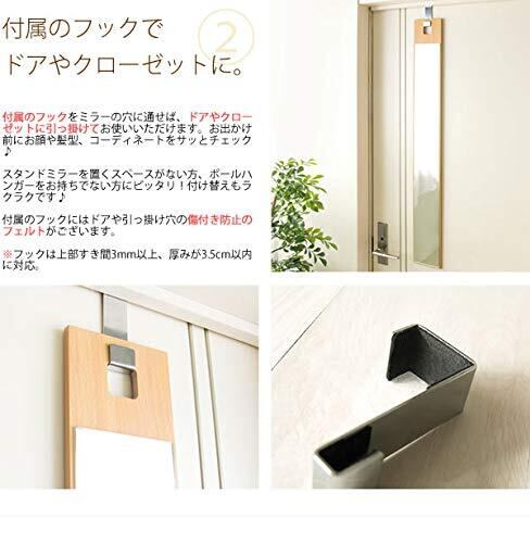お出かけ前にお顔や髪型、コーディネートをサッとチェック、金属のフックをミラーの穴に通せば、ドアやクローゼットに引っ掛けてお使いいただけます。