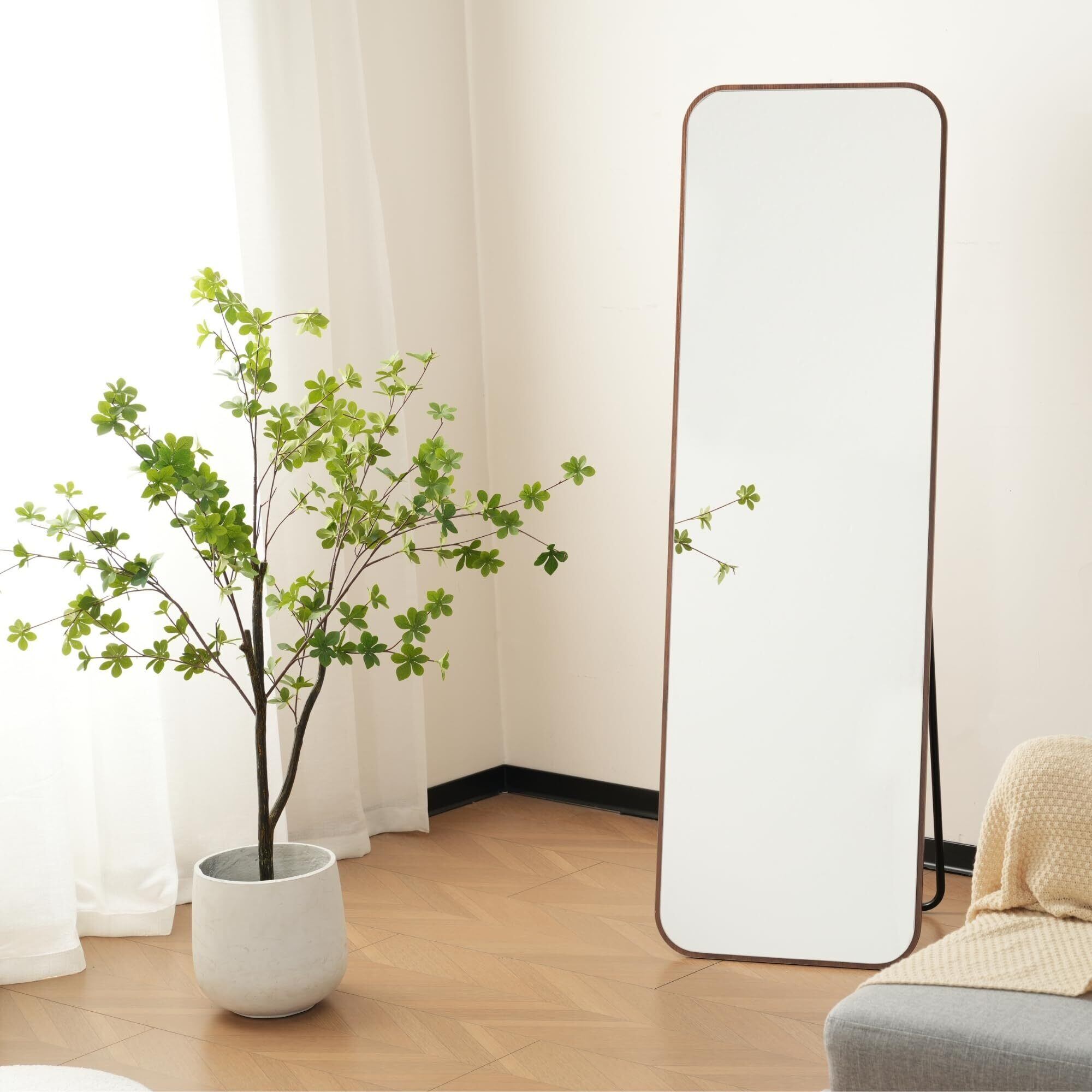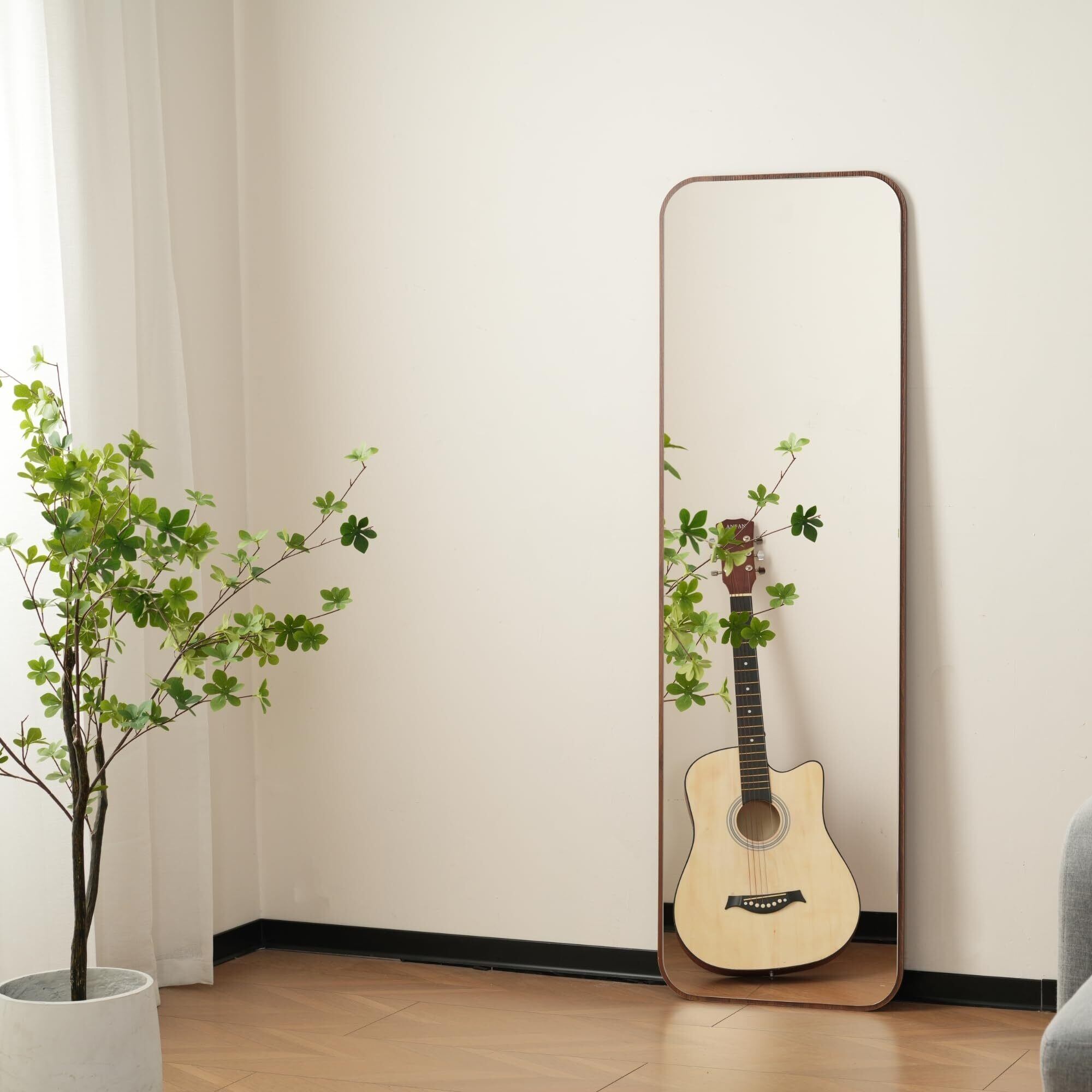 OSJ 姿見鏡 北欧風 丸角ウッドフレーム ミラー 自立式 スタンド 壁掛け モダン 防飛散加工 160×50cm ブラウン