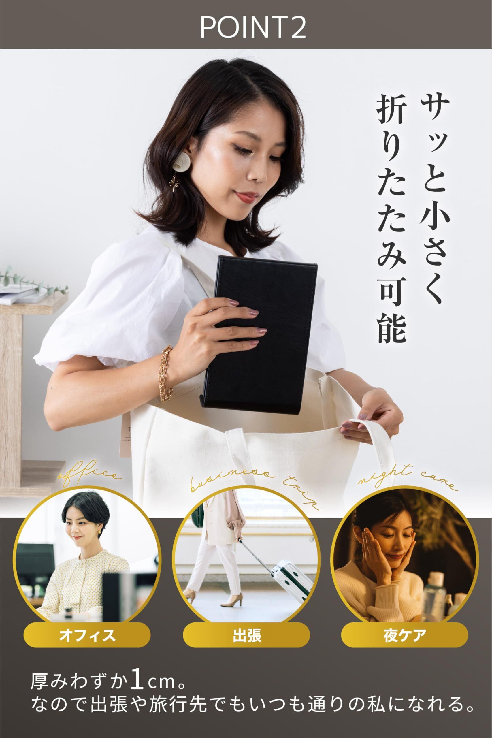 【選べる15通り!3サイズ×5カラーで、ライフスタイルに合わせて】 M(携帯用)・L(万能サイズ)・LL(自宅用)の3サイズと、ブラック・ブラウン・キャメル・プラチナ・サファイアの5色。通勤バッグ常備用と自宅デスク用で2サイズ持ちも人気。折りたたみ式でコンパクト収納、ドレッサーいらずで省スペース。旅行・出張・オフィスでマルチに活躍します。