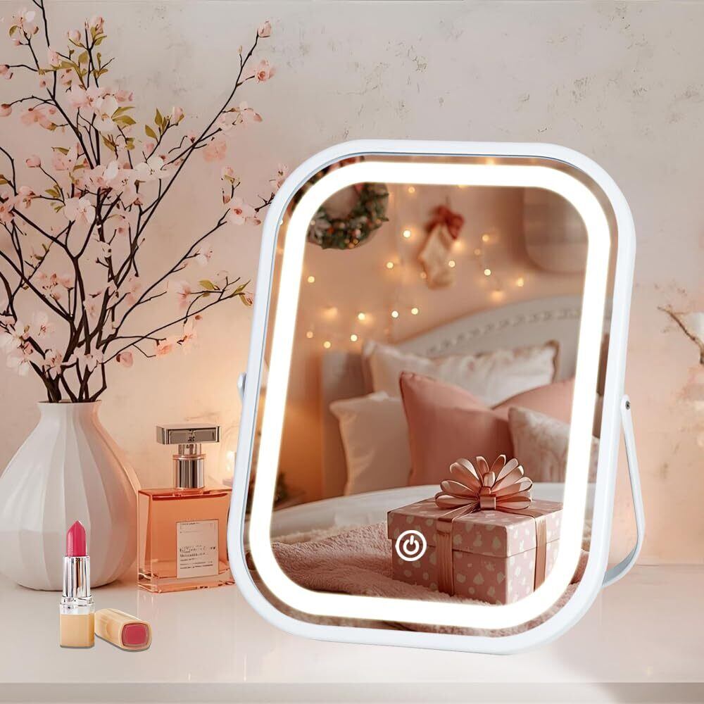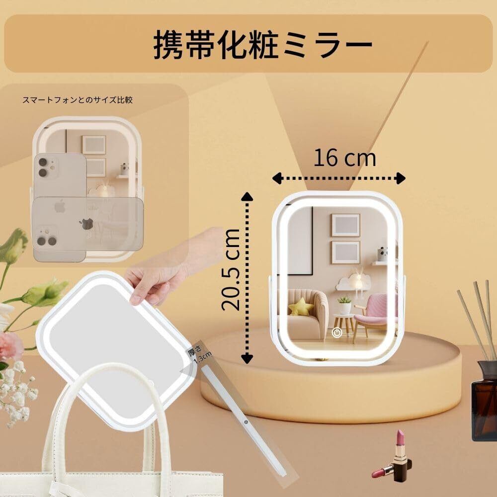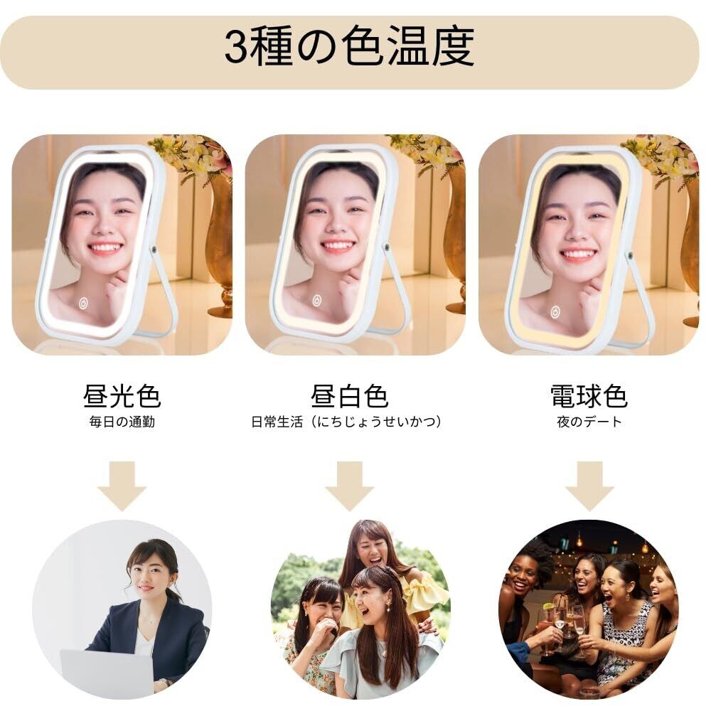 LEDライト付き 化粧鏡 卓上 女優ミラー 3色調光 角度調整可能 折りたたみ式 充電式 持ち運び 旅行用 置き鏡 ホワイト