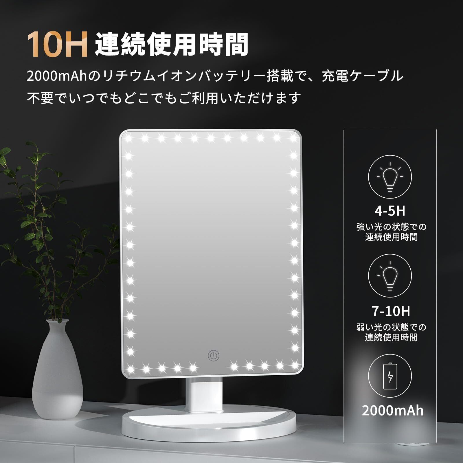 【2000mAh充電可能なリチウムバッテリー内蔵】:FASCINATE 大型卓上女優ミラーは、2000mAhの充電可能なリチウムバッテリーを内蔵ており、一度の充電で最大10時間連続作動ができます。頻繁に充電する必要はありませんので、外出や旅行などの場合に持ち運ぶ便利です。ミラーは、モバイルバッテリーやパソコンなどのUSB経由で充電することができます。化粧鏡の底部にはソフトパッドが付いており、鏡が台座に安定して立つことができます。