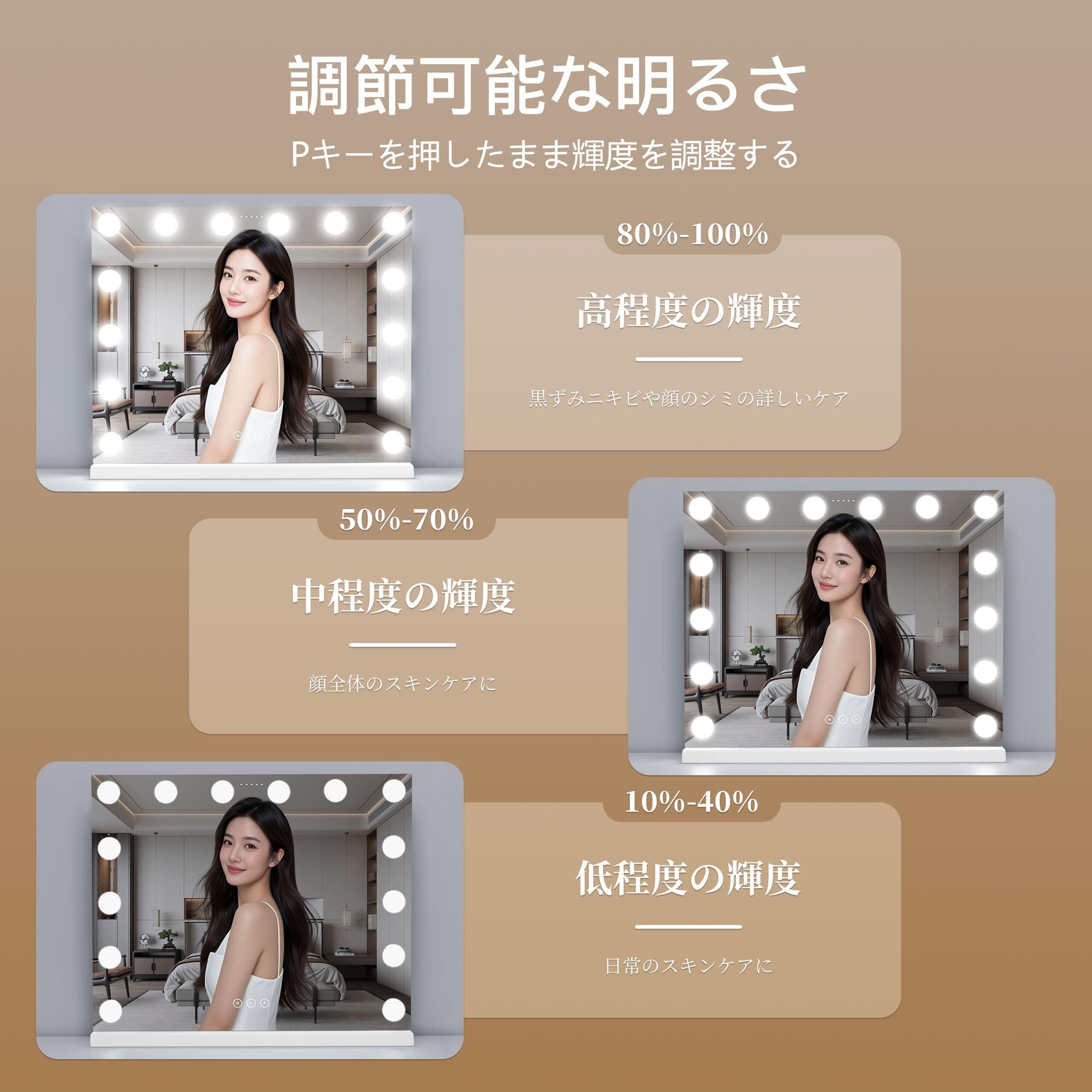 【明るさ調整可能&スマートメモリー機能】- 操作もシンプルで、ワンタッチでライトのオンオフ切り替えが可能。ボタンMは光のモードを調整でき、ボタンPは明るさを調整できます。このミラーのすごいところが、調光を記憶できるので前回調整した適切なライトを使いやすく、毎回明るさを調整する必要がないところです。