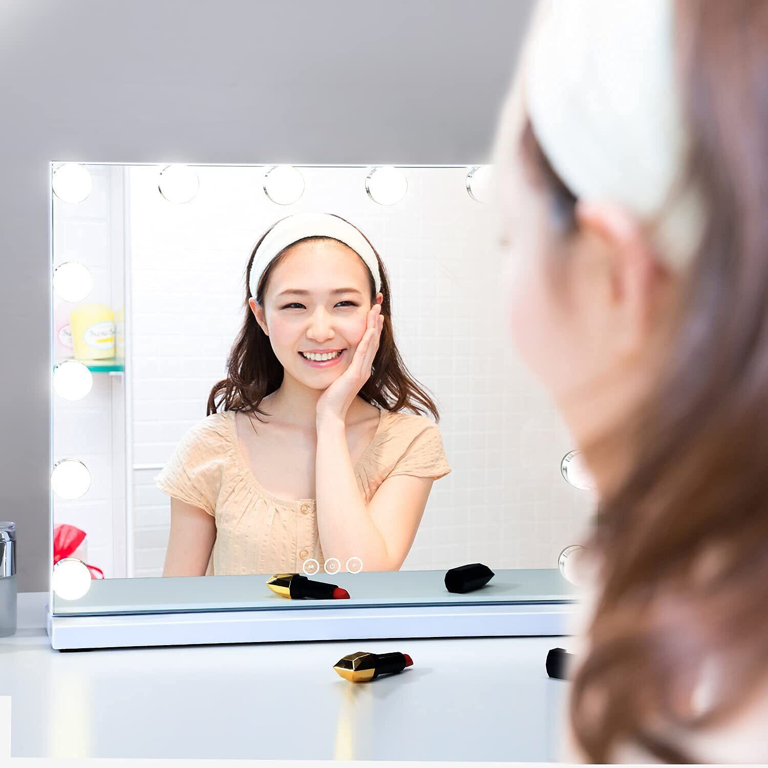 【14個led電球な大いミラー】-大型化粧鏡として、顔全体のバランスを確認することができる上に、ヘアスタイルとのバランスを取ることも便利です。前面だけではなく側面からも光が漏れ流れ、鏡の周りにライトが付いていたことによって、影を作らず顔全体を映せメイクがしやすい。ドレッサーや化粧台に設置し、ハリウッドな雰囲気でメイクをより快適にさせます。