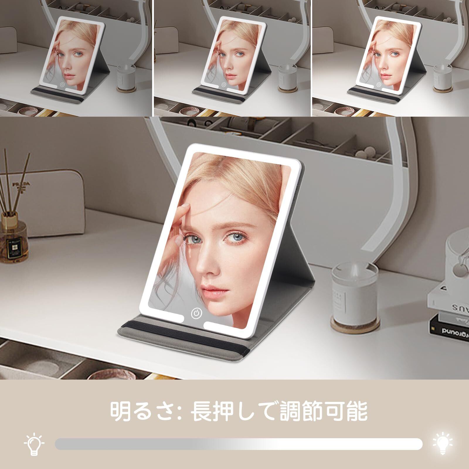 【3色調&無段階調光可能な卓上鏡】: 軽く押すと電球色・白色光・自然光の3色調を切り替え可能です。長押すと明るさが無段階に調整することができます。朝や夜など暗い時間帯でも、パーティー・オフィスなど、シーンにあわせ完璧な光を提供します。卓上鏡としても最適で、メイクの仕上がりをサポートします。明るさが足りないと感じたり、明るさを調節できない場合は、ボタンを長押ししてみてください。
