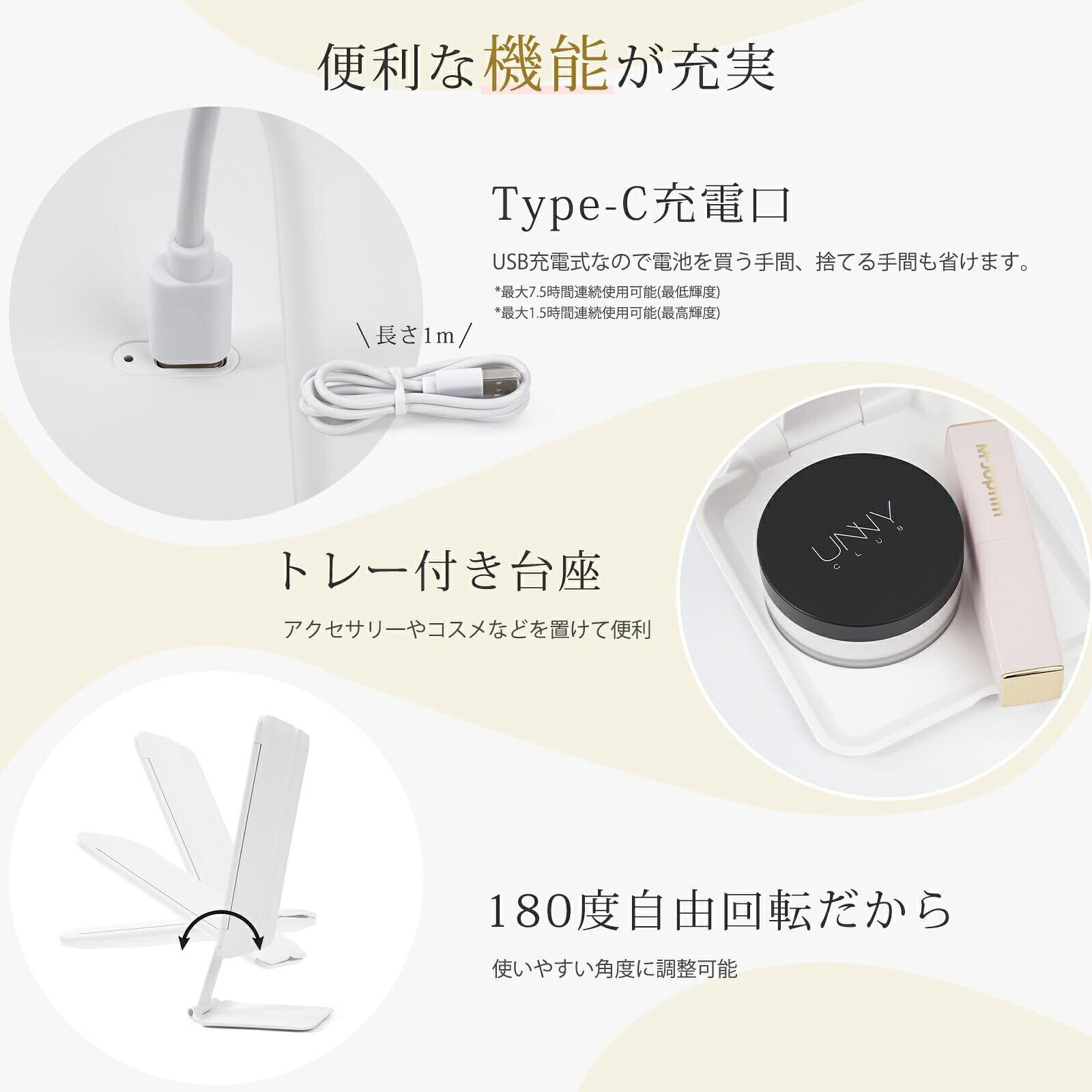 【自由角度調整・長持ち】このメイクミラーは、180度回転可能なので、最適な角度で見やすく調整できます。Type-c充電式でわずか1.5 時間の充電で最大7.5時間の動作が可能で、外出先での長時間お直しメイクにも安心。