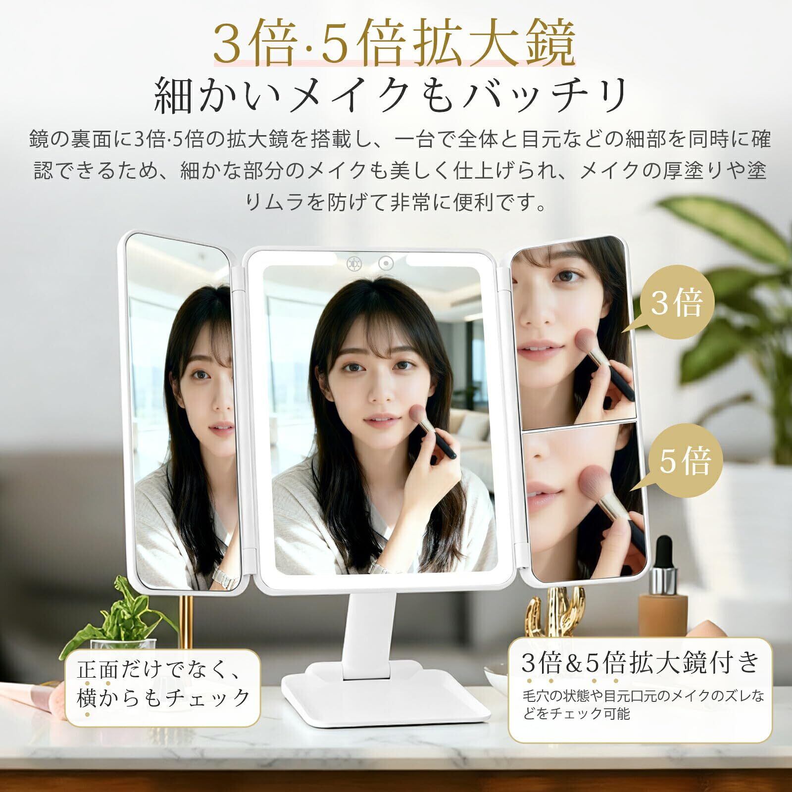 DGV 女優ミラー LEDライト 三面鏡 3倍&5倍拡大鏡付き 折りたたみ 3光色切替 明るさ無段階調光 メモリー機能 消し忘れ防止機能 180度回転 USB充電式 角度調整 収納ペース メイク 軽量 ホワイト