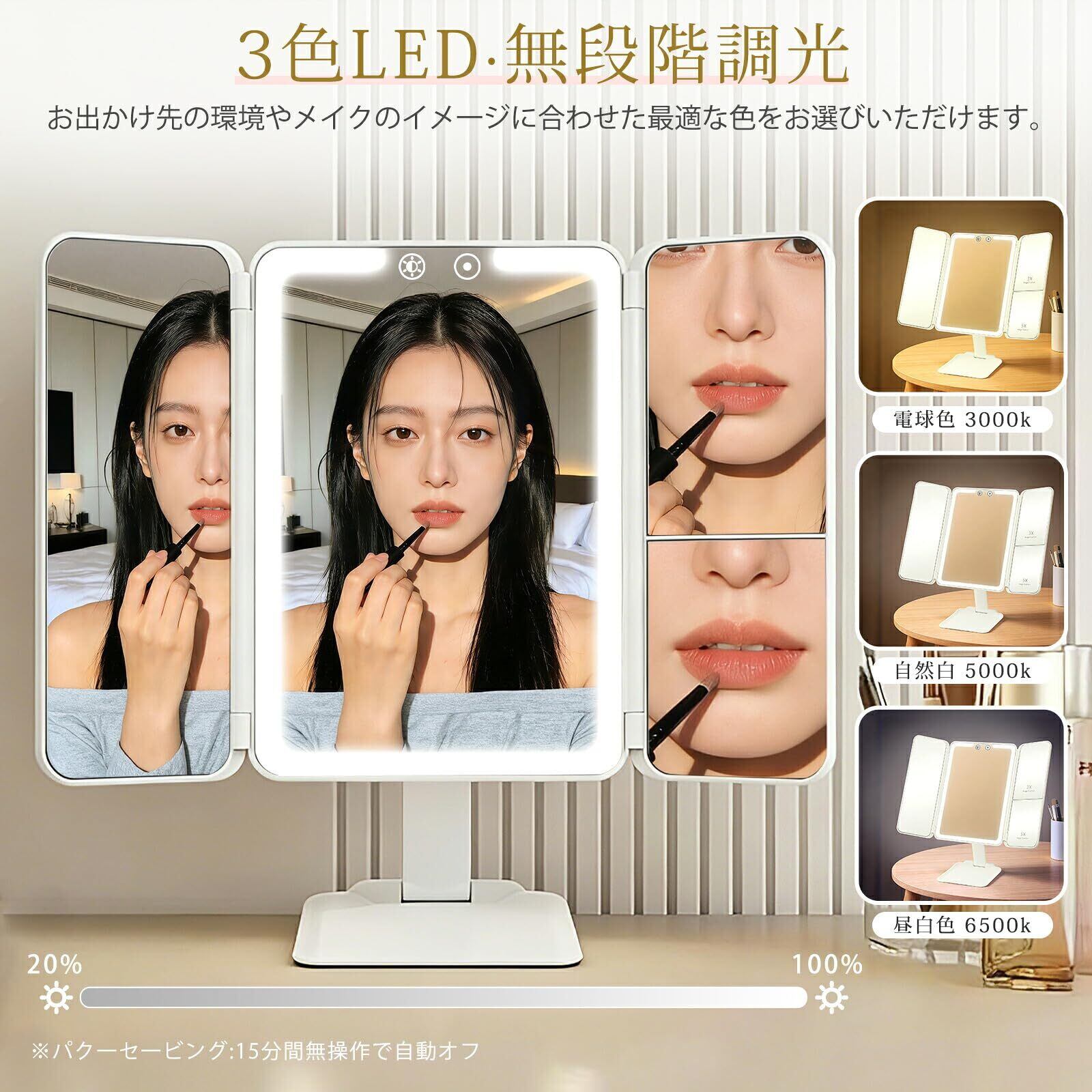 【新着商品】DGV 女優ミラー LEDライト 三面鏡 3倍&5倍拡大鏡付き 折りたたみ 3光色切替 明るさ無段階調光 メモリー機能 消し忘れ防止機能 180度回転 USB充電式 角度調整 収納ペース メイク 軽量 ホワイト