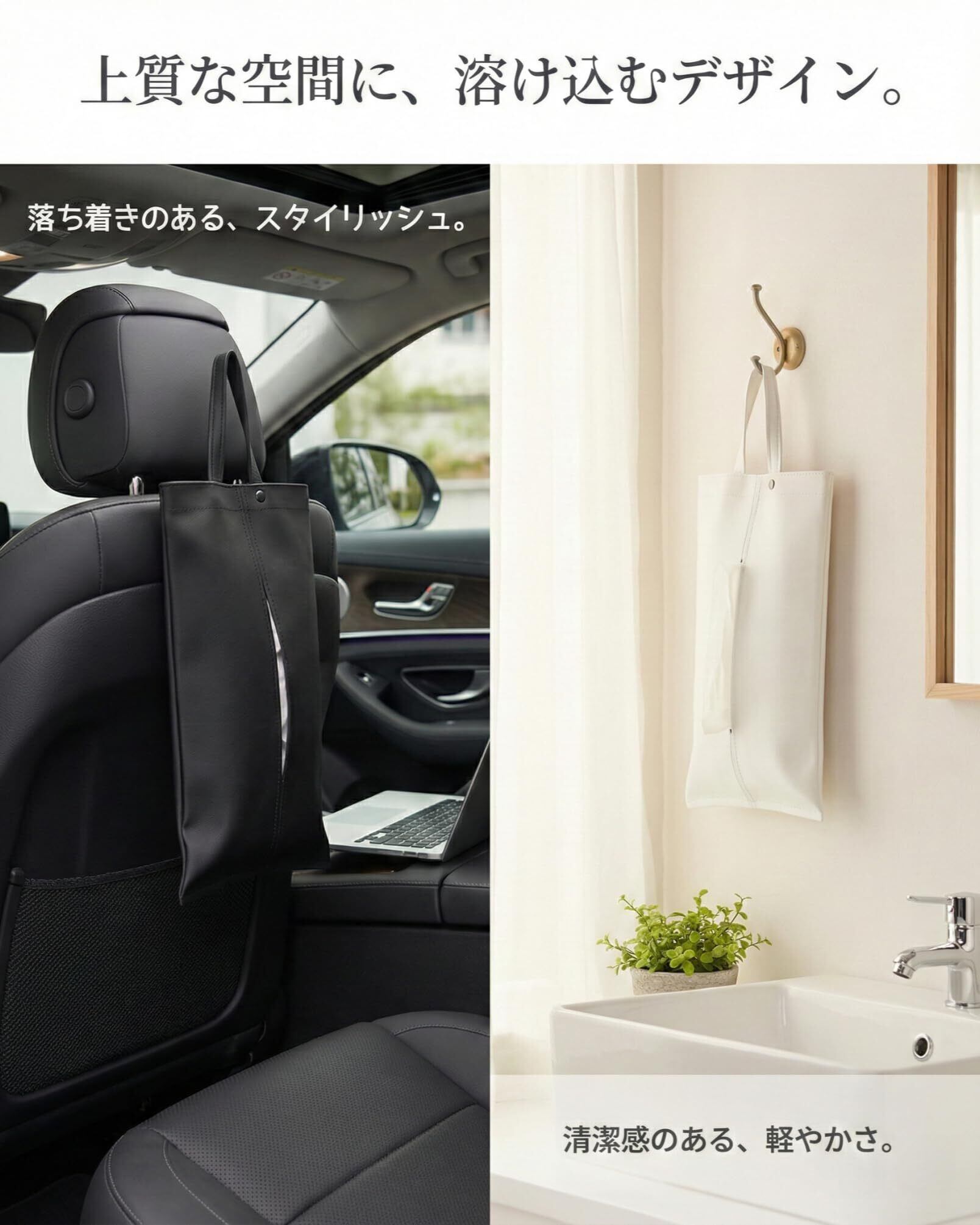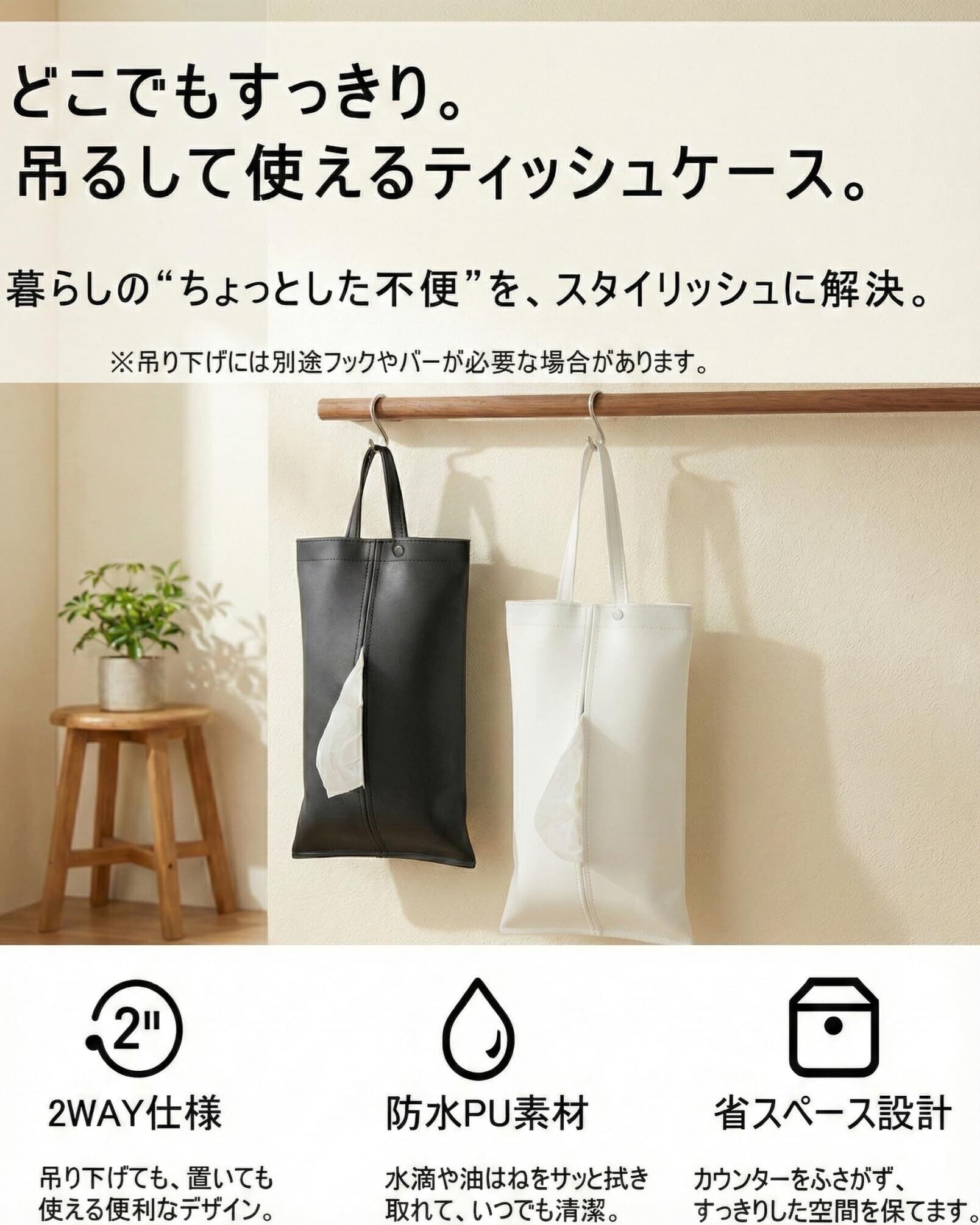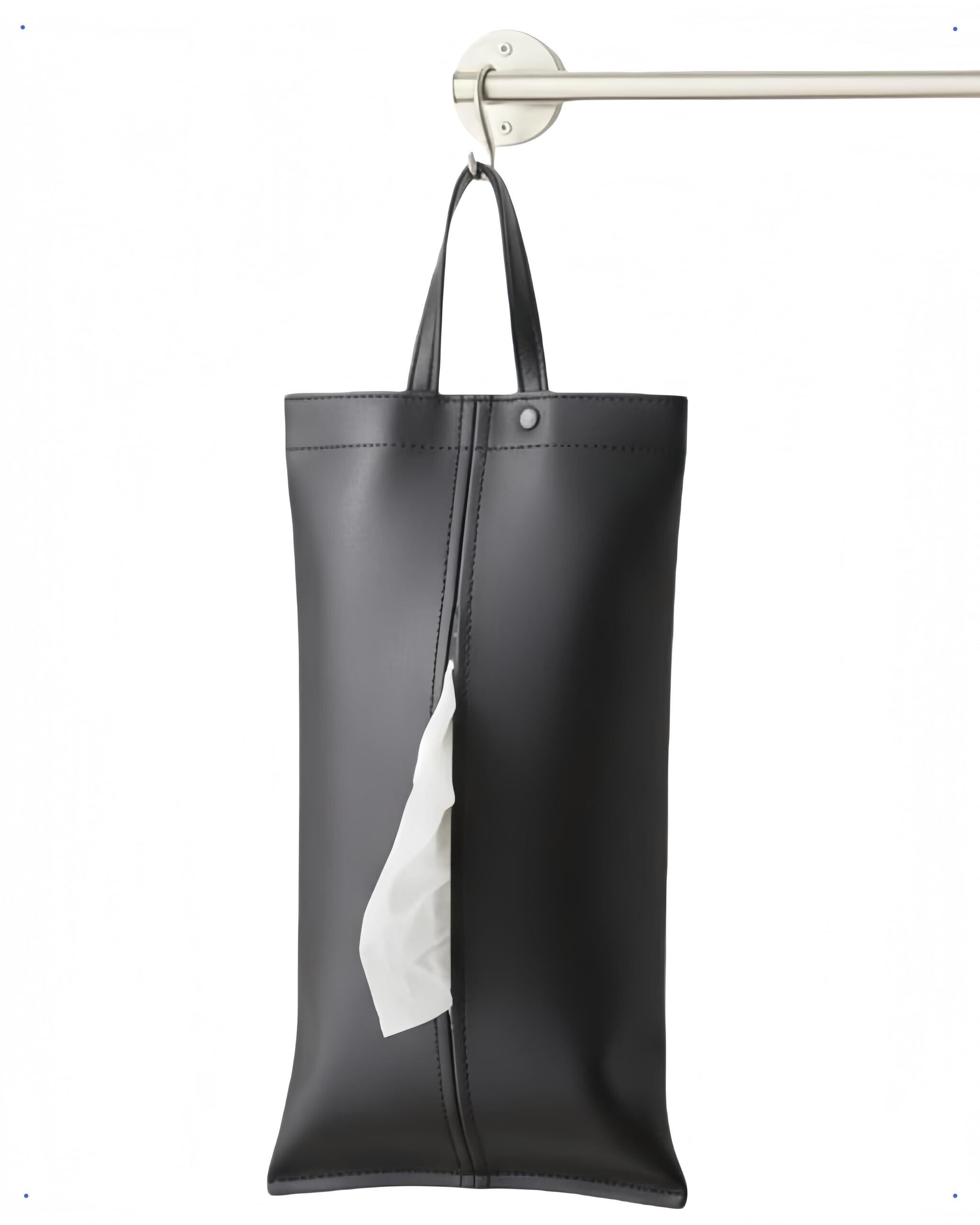 【数量限定】LightBeam ティッシュケース 吊り下げ 壁掛け 2WAY仕様 防水PUレザー 省スペース設計 車内・キッチン・洗面所対応 ブラック