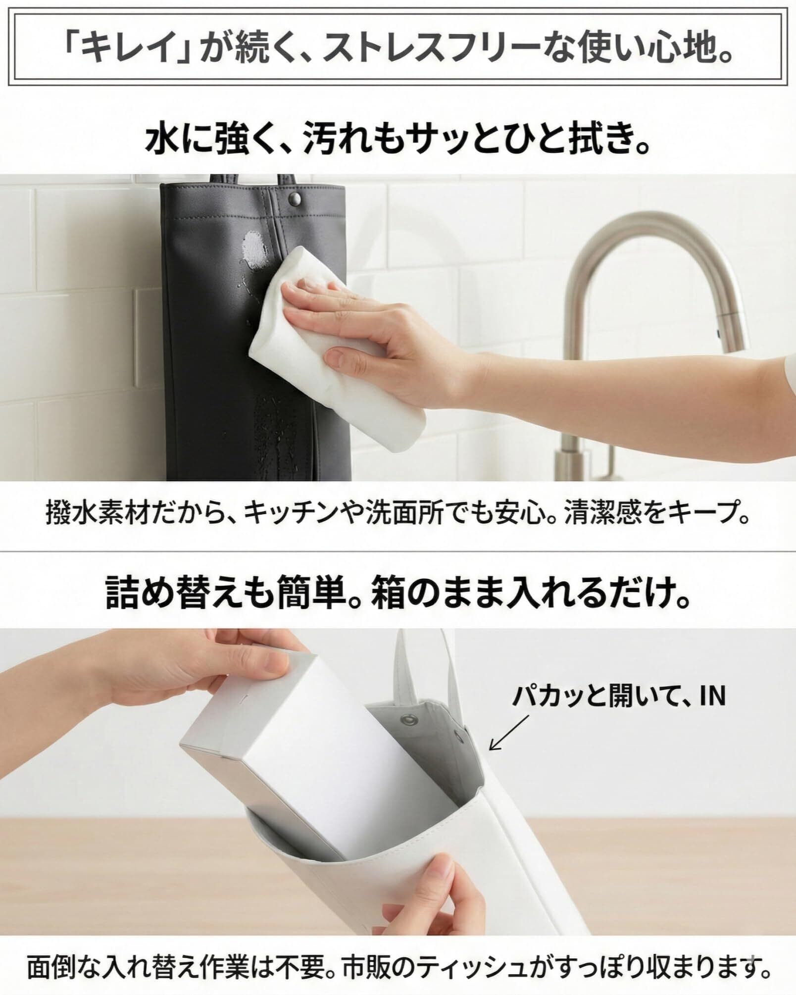 【省スペース&使いやすい構造】台面をふさがず、動線を邪魔しない設計。片手でスッとティッシュを引き出せる快適な使用感。