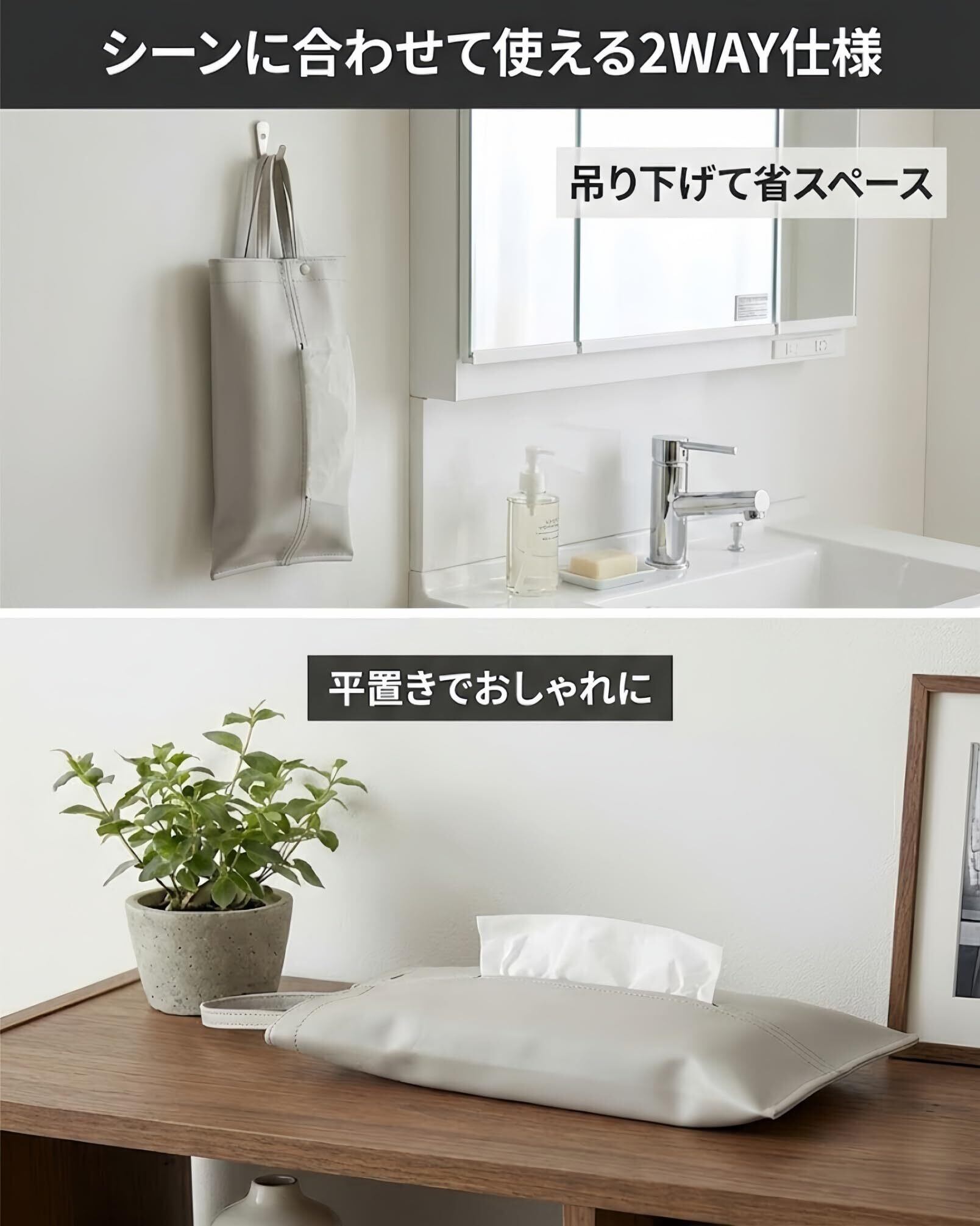 【2WAY仕様(吊り下げ+平置き)】吊り下げて使うのはもちろん、カウンターや洗面台での平置きにも対応。シーンに合わせて自由に使える万能デザインです。