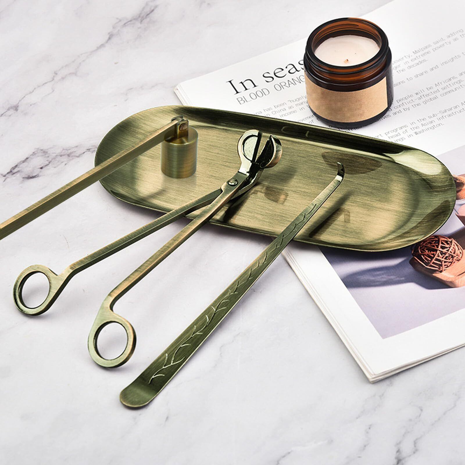 4点セット:キャンドルアクセサリーセットは火消し用のキャンドルスナッファー、キャンドル芯を切る用のキャンドルトリマー、芯が斜めた時に直す用のキャンドルディッパー、キャンドル受け皿の四点が含めており、実用性が高いです。