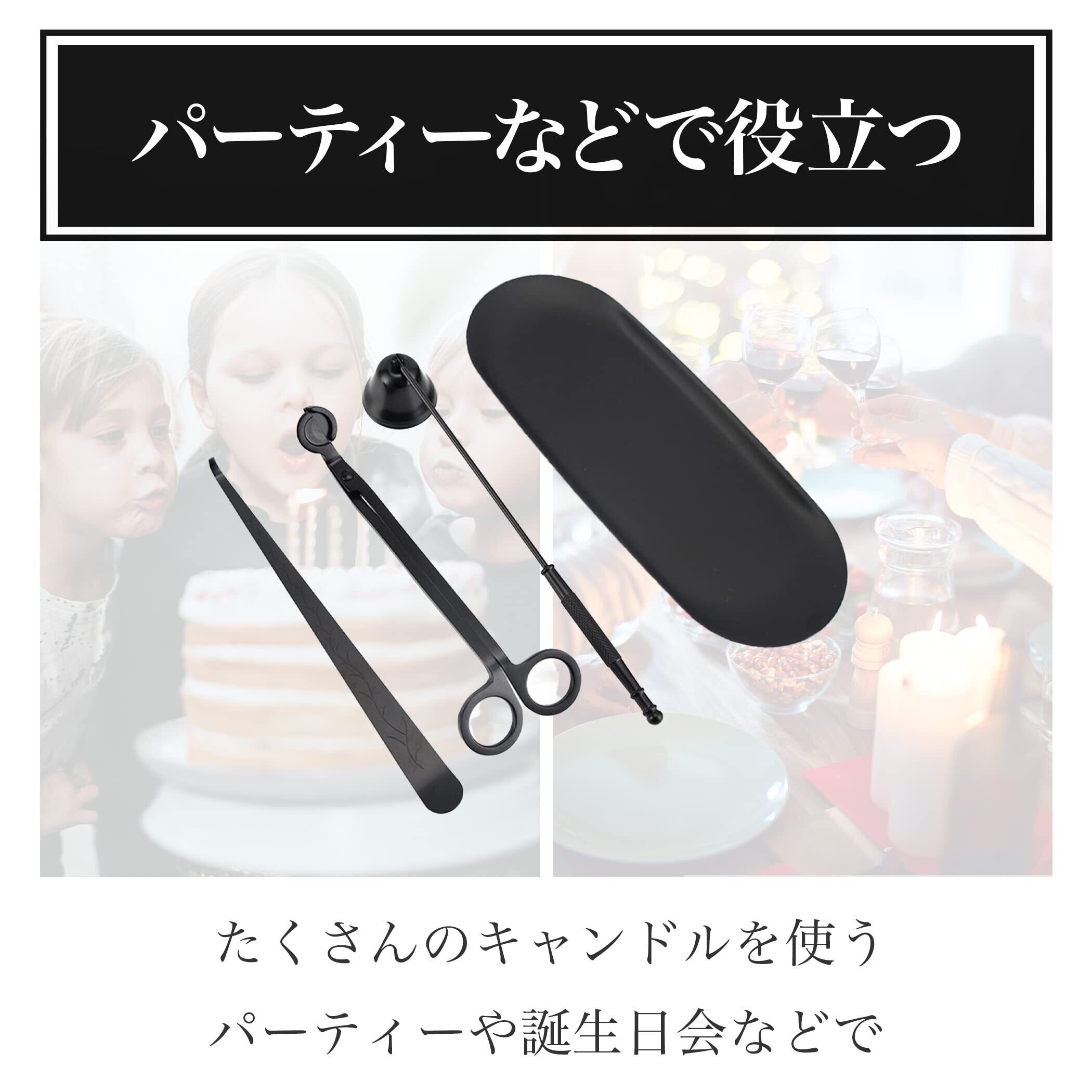 パーティーや誕生日会などで役立つ:たくさんのキャンドルを使うパーティーや誕生日会などでこのツールがあると便利です。キャンドルスナッファーがあれば、離れた場所からでもテーブルの上のキャンドルの炎を簡単に消すことができますし、芯切りハサミで芯をカットすれば次に使う時に楽に点火できます。