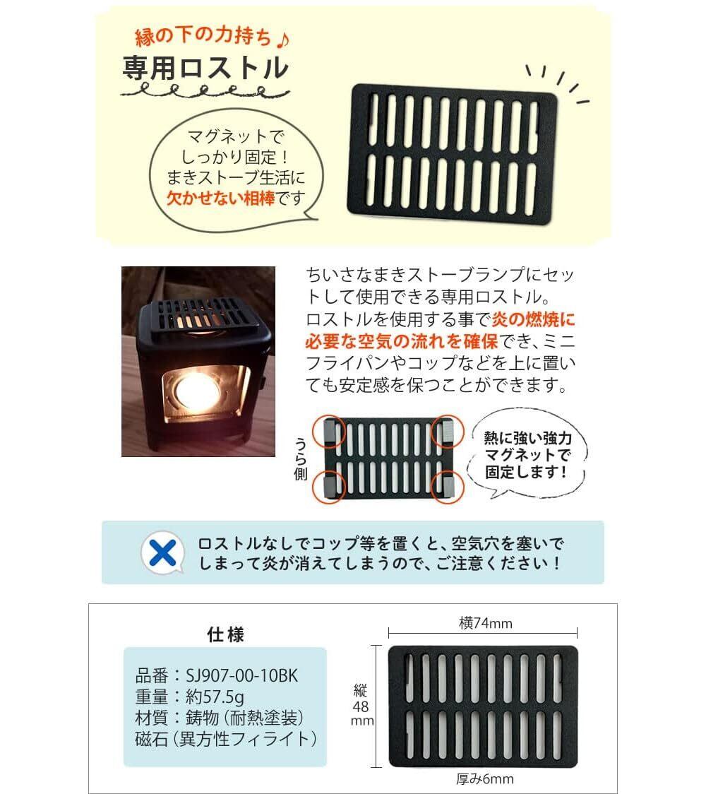 ちいさなまきストーブランプ専用ロストル:サイズ/W74×L48×H6mm 重量/57.5g 材質/鋳物(耐熱塗装)、磁石(異方性フィライト)
