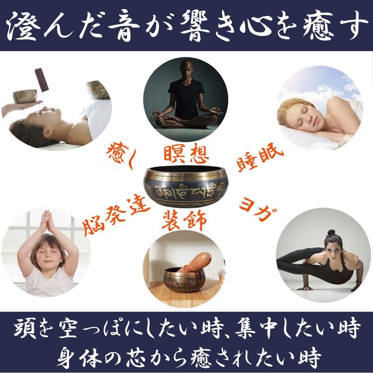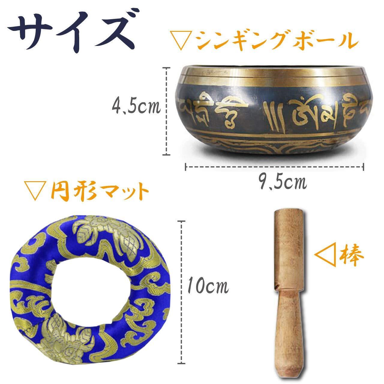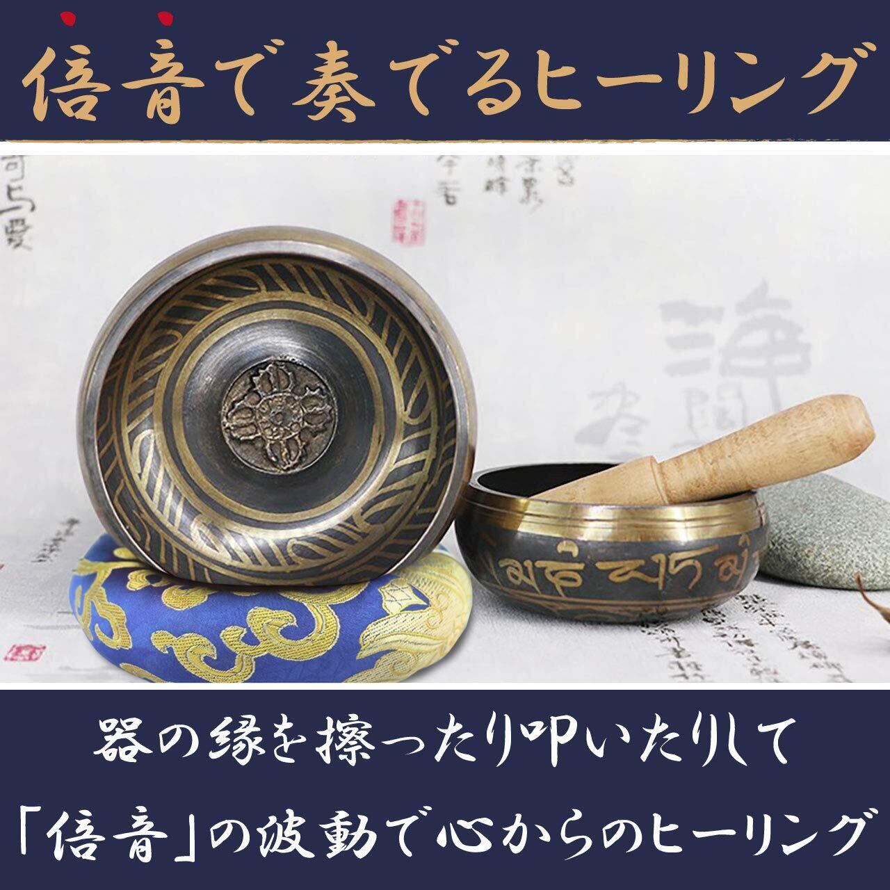 セット内容:シンギングボウル、スティック、円座マットの3点 本体(サイズ:口径約9.5cm、高さ約4.5cm 重量:約300g 材質:銅) 円座マット(サイズ:直径10cm 重量:40g) ※モニターの環境等により、色の見え方に若干差が生じる場合がございます。