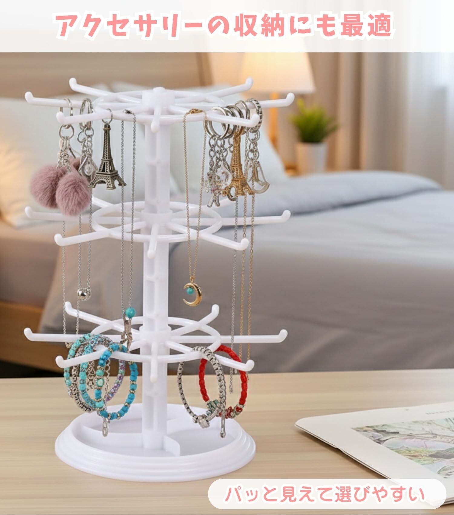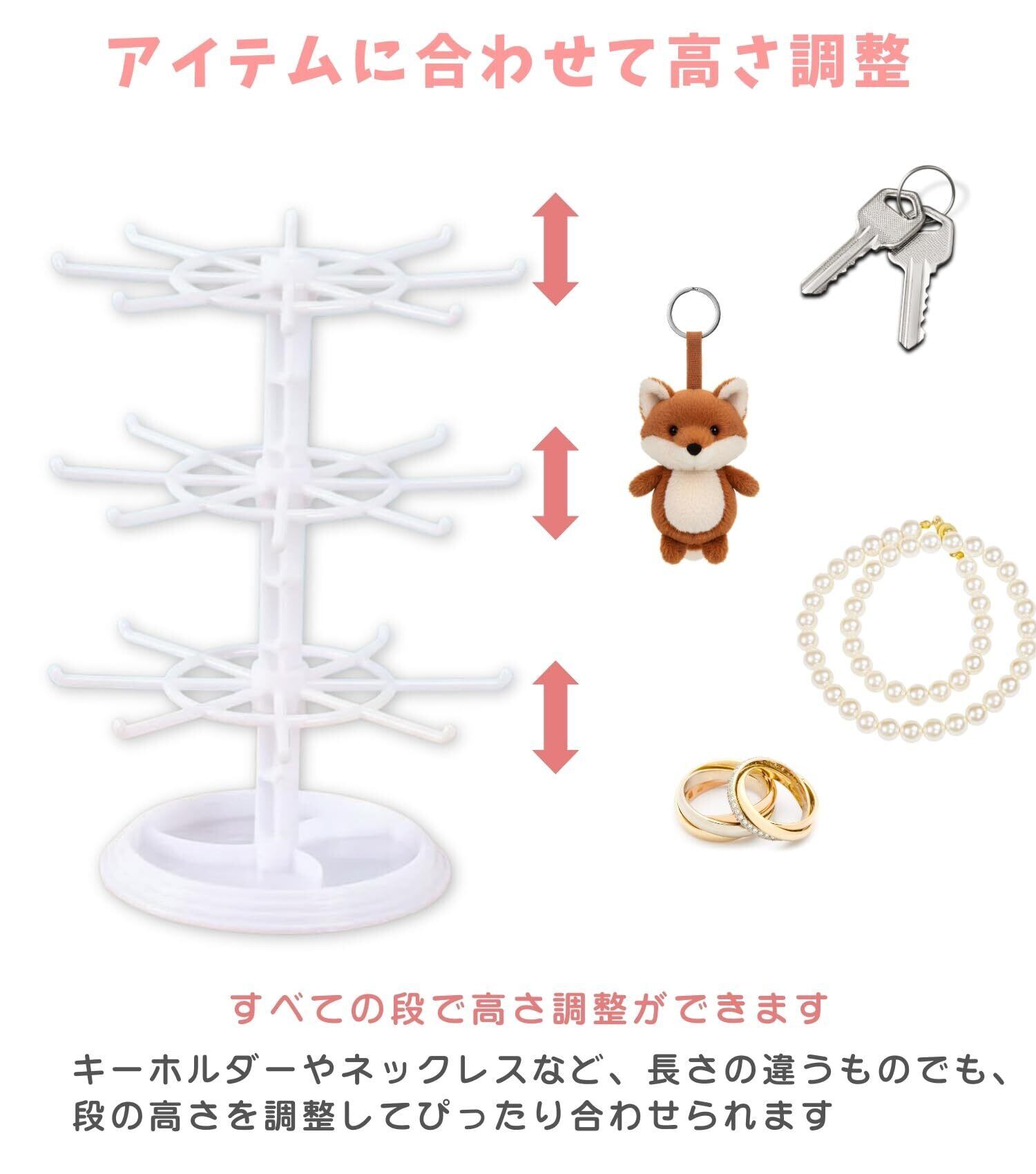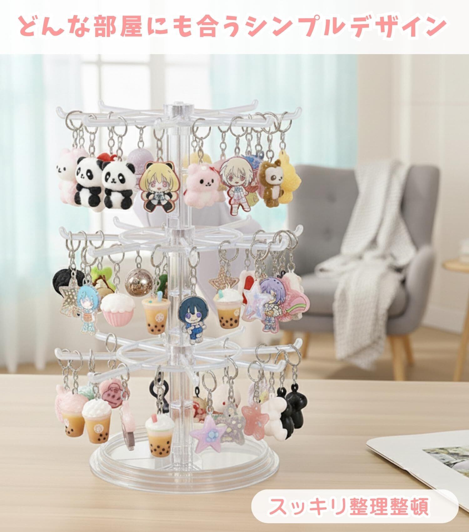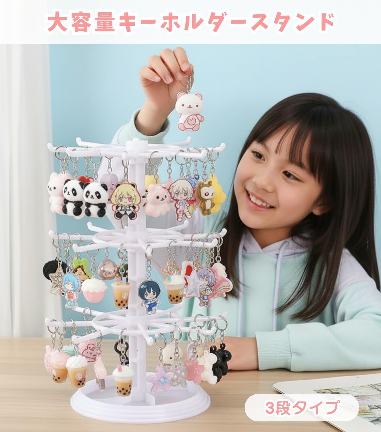 【大容量3段スタンド】3段の大容量で、たくさんのアイテムを一度にディスプレイできます。キーホルダーやアクセサリーの整理にも最適で、ごちゃごちゃしがちな小物をスッキリ「見せる収納」で片付けられます。