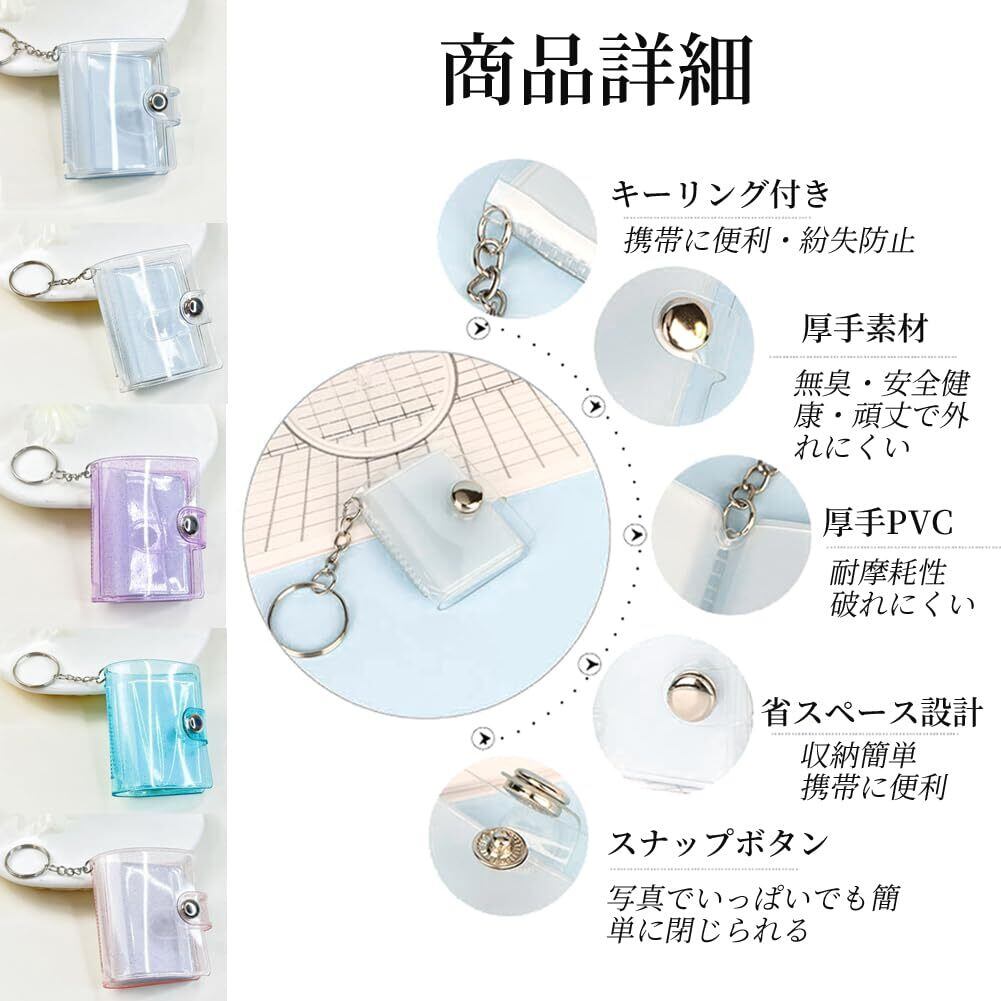 【商品仕様】材質:PVC;カバーサイズ:5.5×6.5cm、カードサイズ:3.9×5.2cm;2インチ写真対応。透明・青・ピンク・紫など5色のミニアルバムキーホルダーを同梱。各アルバムには20枚の内ページが含まれます。(ご注文前にアルバムサイズが写真サイズと一致するかご確認ください。)
