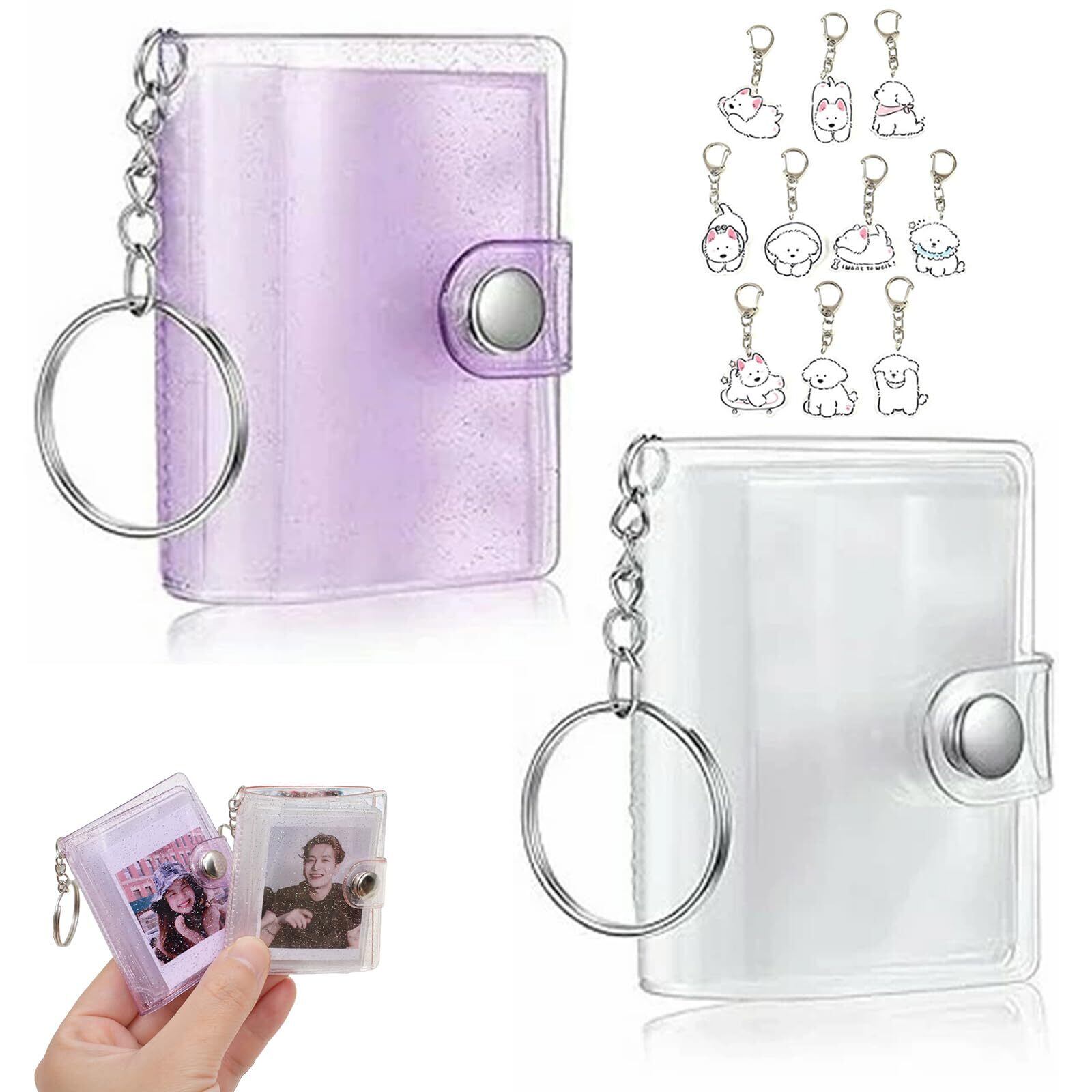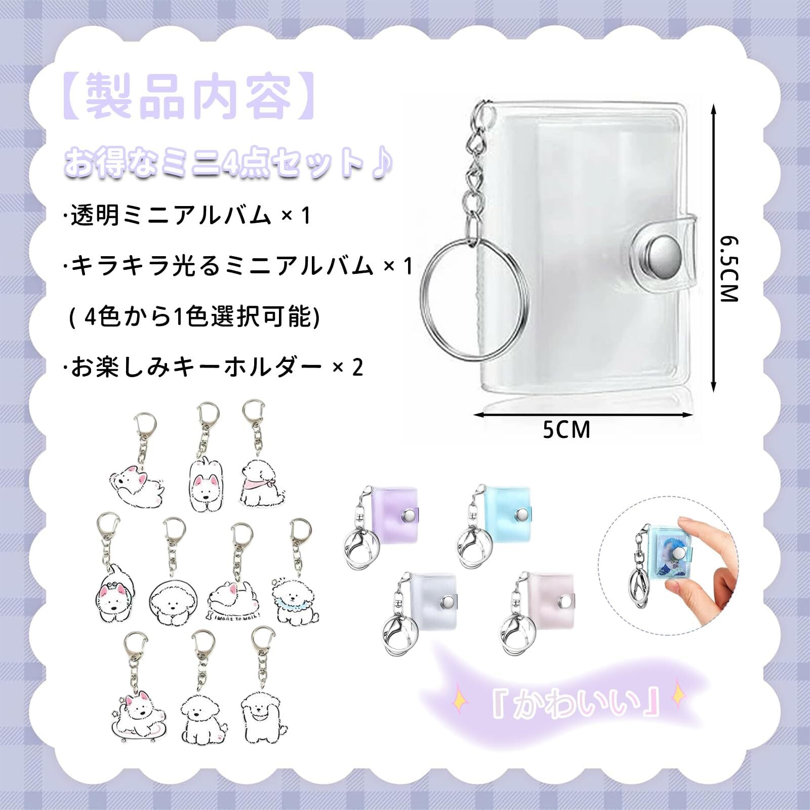 【手のひらサイズで携帯に便利な2個セット】透明ミニアルバム1個と、キラキラ光るミニアルバム1個(ブルー/ピンク/パープル/ホワイトから選択)のセット。さらに可愛いキーホルダーが2個付き、合計4点で思い出を楽しく整理・携帯できます。